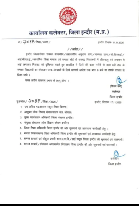 देवास में कलेक्टर ऋतुराज सिंह ने भी बच्चों की सुरक्षा को ध्यान में रखते हुए स्कूलों के समय में बदलाव किया है। जिले के सभी स्कूल अब सुबह 10 बजे से पहले नहीं खुलेंगे, जिससे बच्चों को सुबह की कड़ाके की ठंड से बचाया जा सके।