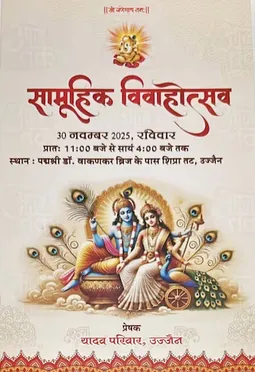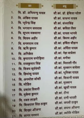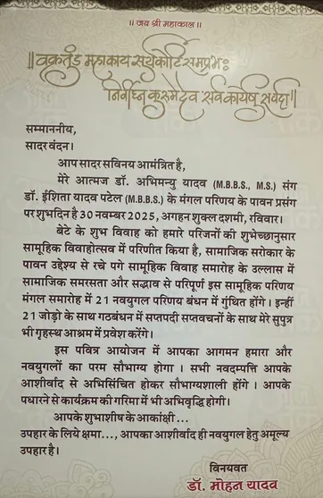 मुख्यमंत्री मोहन यादव ने निमंत्रण कार्ड में लिखा है, मेरे बेटे डॉ. अभिमन्यु यादव का विवाह डॉ. ईशिता यादव पटेल से हो रहा है। यह विवाह सामूहिक विवाह उत्सव का हिस्सा होगा। इसमें 21 जोड़े एक साथ शादी करेंगे। सीएम मोहन यादव ने इसे सामाजिक संतुलन और मेल-जोल से भरा आयोजन बताया है। इसमें उनके बेटे डॉ. अभिमन्यु यादव विवाह के बंधन में बंधेंगे।