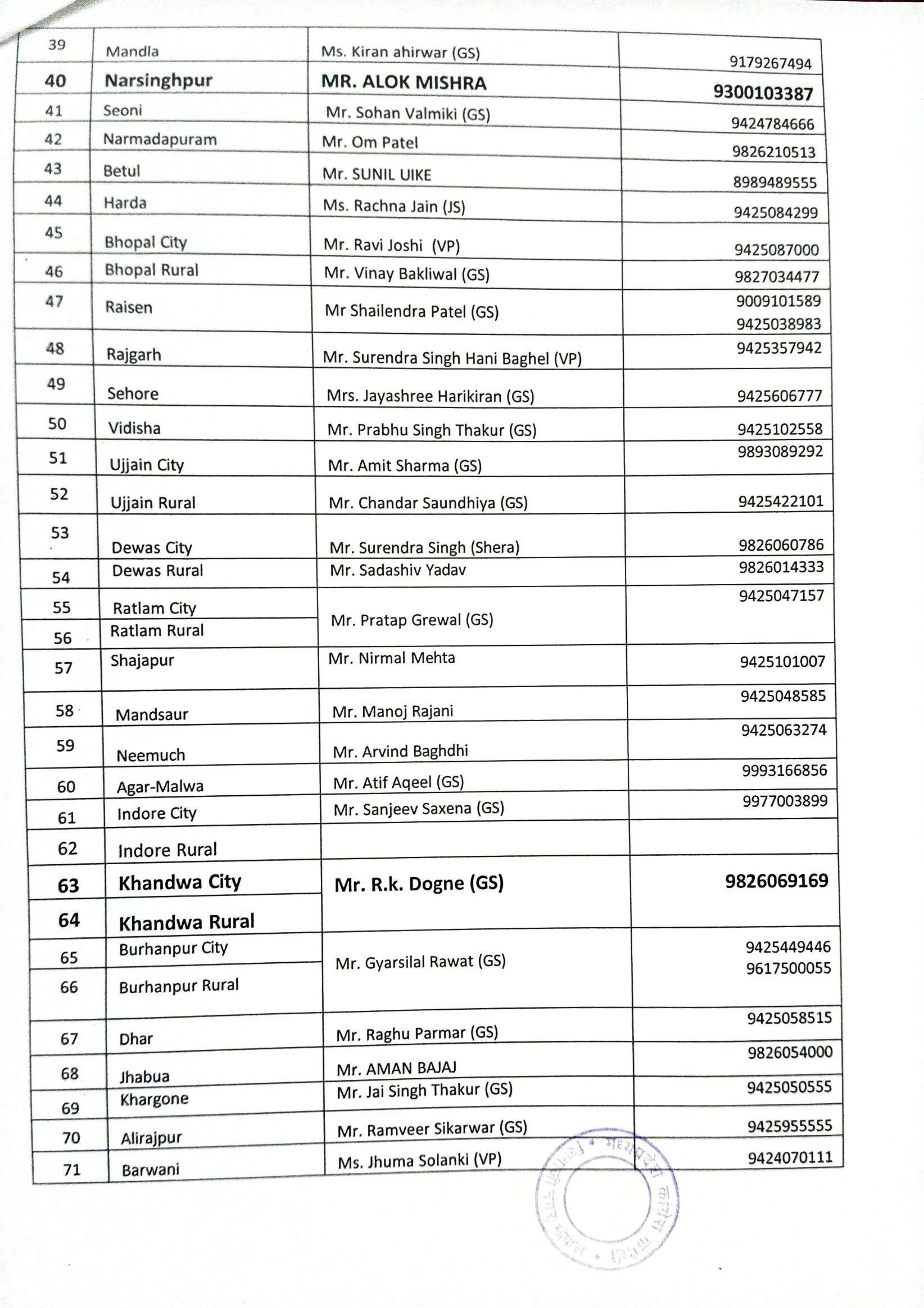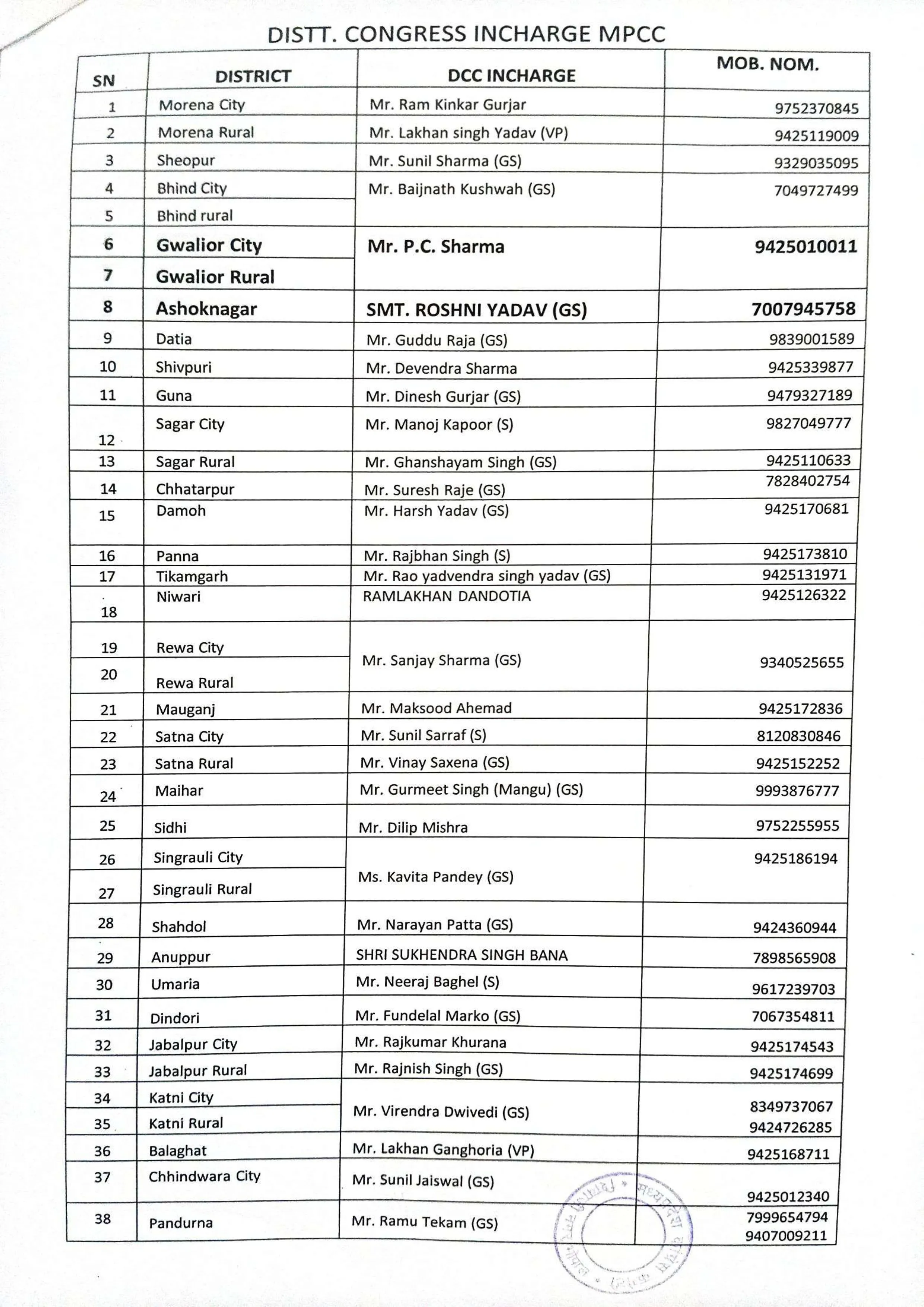 अब, आइए जानते हैं कि मध्यप्रदेश के विभिन्न जिलों के कांग्रेस के नवनियुक्त प्रभारी कौन हैं-
