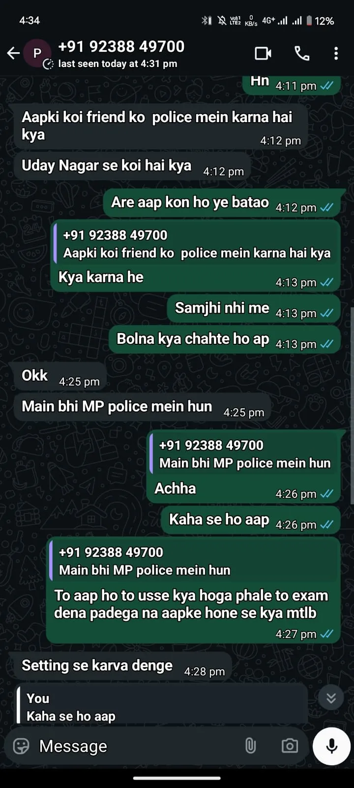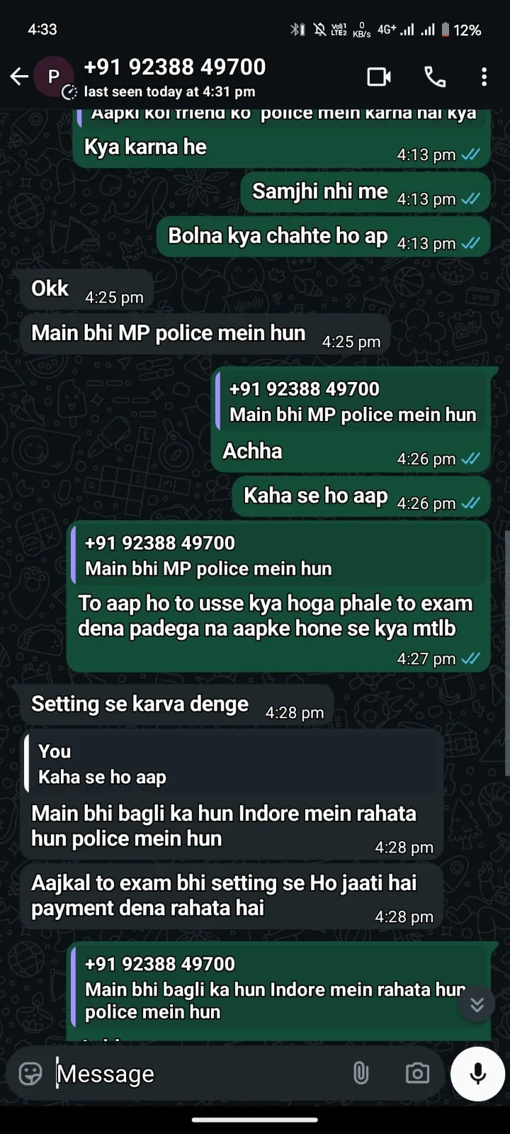 कॉल करने वाला खुद को पुलिसकर्मी बताता है। साथ ही, कहता है कि वह पहले विजयनगर इंदौर थाने में था और अब उज्जैन में पदस्थ हूं। मूल रूप से देवास का हूं।