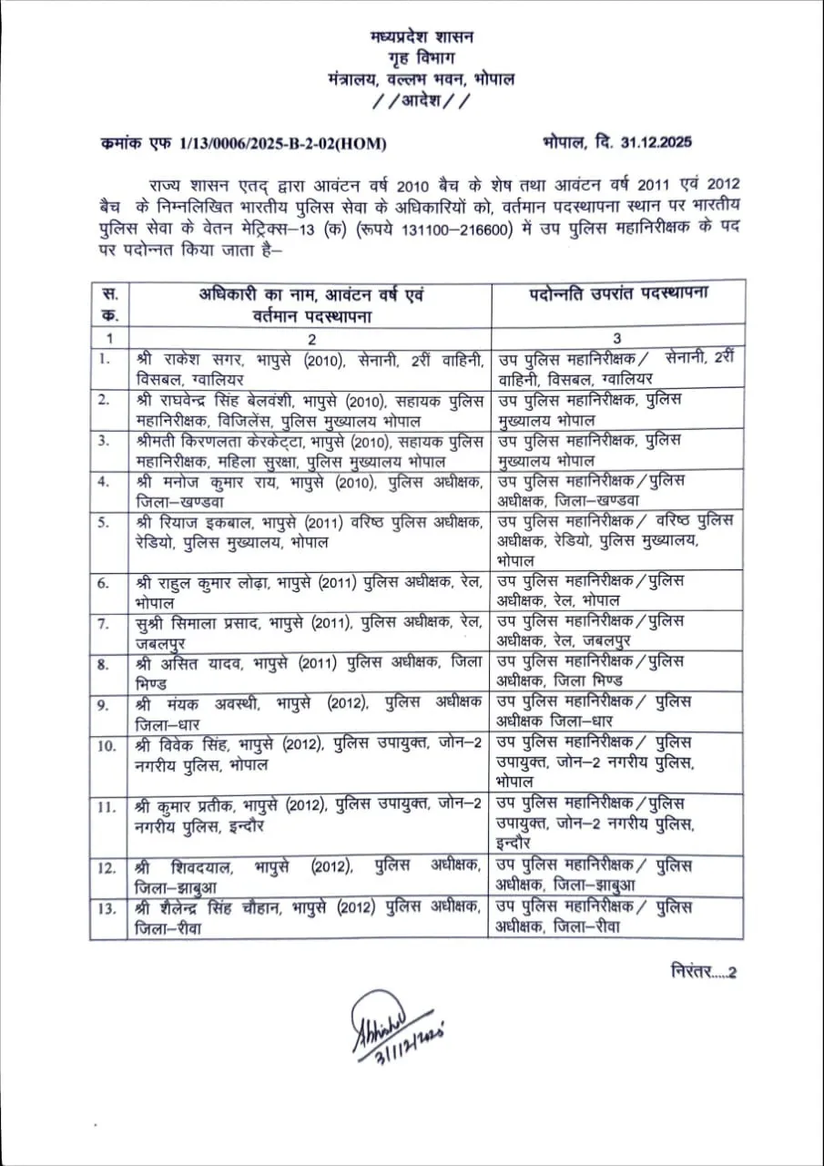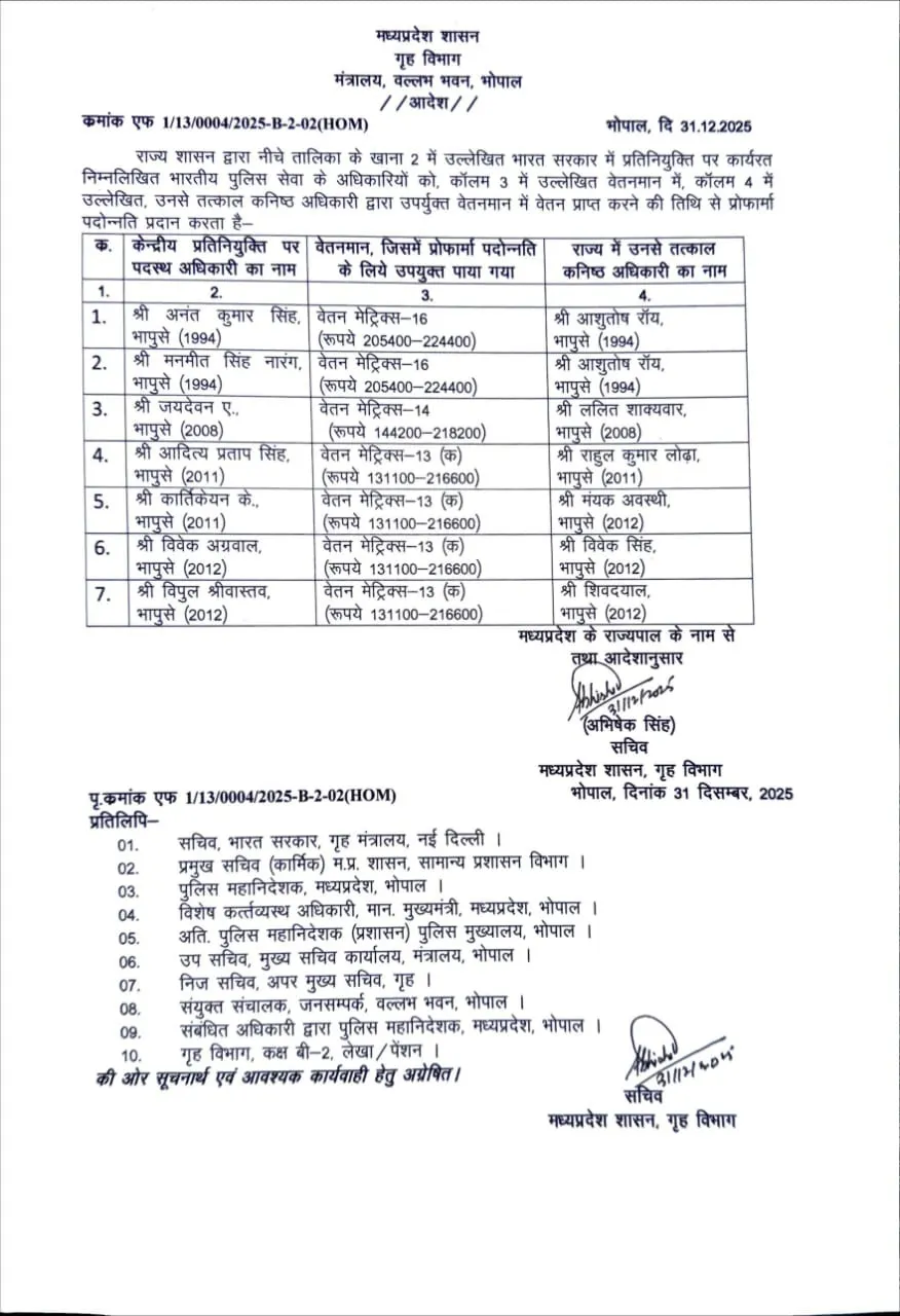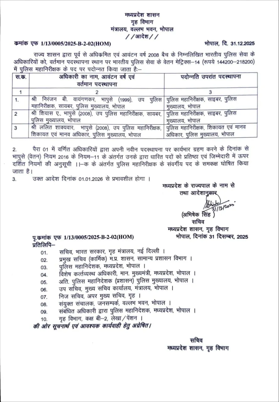 नए साल से लागू होने वाले ये आदेश मध्यप्रदेश पुलिस को प्रशासनिक स्थिरता और मनोबल दोनों देंगे। प्रमोशन, नई जिम्मेदारियां और वेतनमान में सुधार से 2026 में कानून-व्यवस्था को और मजबूती मिलने की उम्मीद है।