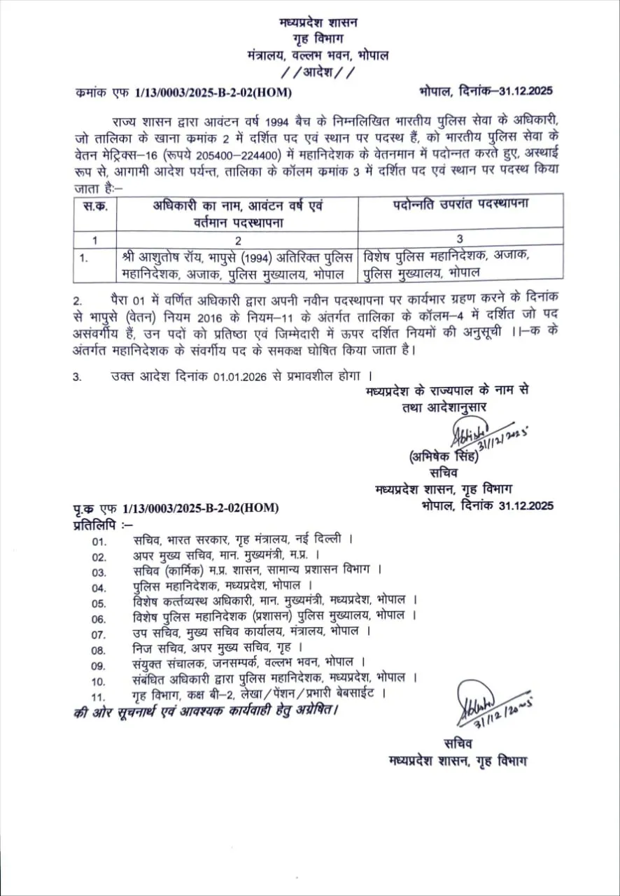 प्रमुख प्रमोशन: आशुतोष रॉय बने विशेष DG