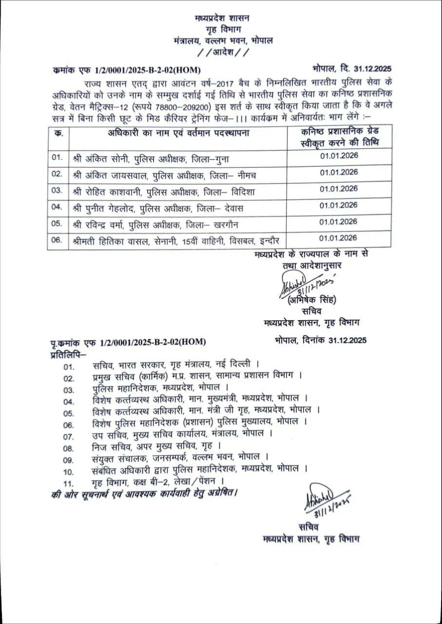 BHOPAL. साल 2025 की विदाई और 2026 के स्वागत के बीच मध्यप्रदेश सरकार ने पुलिस विभाग को बड़ी प्रशासनिक सौगात दी है। गृह विभाग ने प्रमोशन, ट्रांसफर और वेतनमान बढ़ोतरी से जुड़े व्यापक आदेश जारी किए हैं।