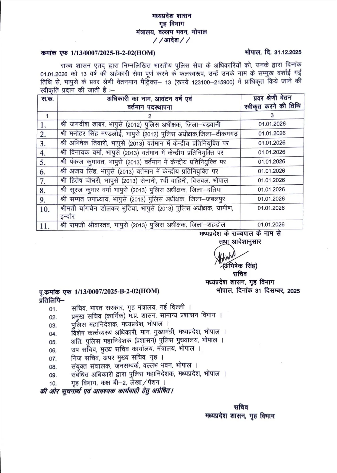 सरकार ने 2012 और 2013 बैच के 11 आईपीएस अधिकारियों को 13 वर्ष की सेवा पूर्ण करने पर प्रवर श्रेणी (Selection Grade) का लाभ दिया है। इन अधिकारियों को अब पे मैट्रिक्स-13 के तहत वेतन मिलेगा। इसमें जिला स्तर पर तैनात एसपी से लेकर केंद्रीय प्रतिनियुक्ति पर कार्यरत अधिकारी शामिल हैं।