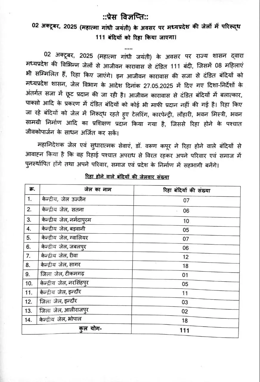 गांधी जयंती के मौके पर उन्हें विशेष माफी दी गई है। राज्य के जेल विभाग के आदेश के अनुसार, ये 111 बंदी मध्यप्रदेश की विभिन्न जेलों में थे। उन्हें अच्छे आचरण और जेल प्रबंधन से सहयोग के आधार पर रिहा किया जाएगा।