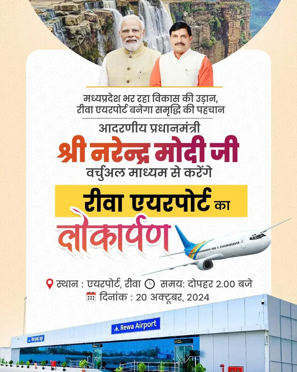 20 अक्टूबर का दिन विंध्य क्षेत्र के लिए ऐतिहासिक होने जा रहा है। इस दिन प्रधानमंत्री नरेंद्र मोदी रीवा एयरपोर्ट का वर्चुअल शुभारंभ करेंगे। मध्य प्रदेश के मुख्यमंत्री डॉ.मोहन यादव ने कहा है कि प्रधानमंत्री नरेन्द्र मोदी (Prime Minister Narendra Modi ) विंध्य क्षेत्र को एयरपोर्ट की सौगात देने जा रहे हैं। रीवा एयरपोर्ट (Rewa Airport ) पूरे विंध्य क्षेत्र के लिये गेम चेंजर साबित होगा, इससे रीवा अंचल (Rewa zone ) में पर्यटन के साथ निवेश को भी बढ़ावा मिलेगा।