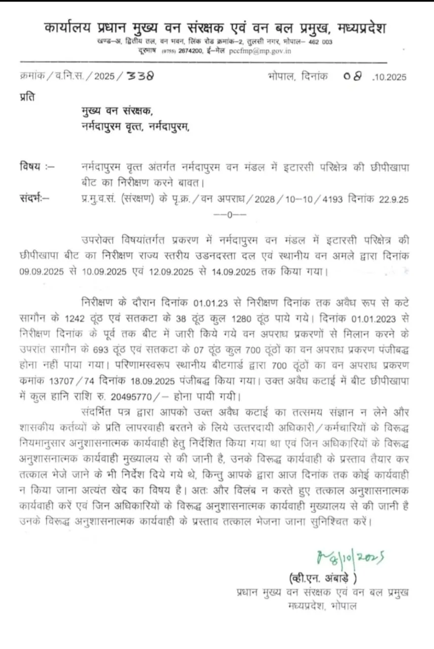 पीसीसीएफ व्ही एन अंबाडे ने डीएफओ पर कार्रवाई करने की सिफारिश की, लेकिन नर्मदापुरम सीसीएफ अशोक चौहान इससे बचते रहे। मामला बढ़ता देख, गत 29 अक्टूबर को डीएफओ को नोटिस जारी किया। हैरत की बात यह कि तवानगर वन सर्किल सीसीएफ कार्यालय से महज एक किमी की दूरी पर है,लेकिन दो साल तक चली इस अवैध कटाई से सीसीएफ अंजान बने रहे।