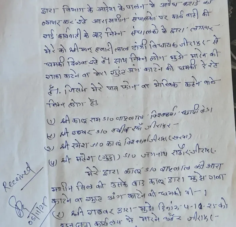 27 अक्टूबर की रात कालूराम नामक आरा मशीन संचालक ने फोन किया। उसने गालियां देते हुए कहा, "तेरी गर्दन कटवा दूंगा, तेरे गुप्तांग काट दूंगा। तू पैसे क्यों नहीं लेता? तूने मेरी मशीन सील कर दी है।"
