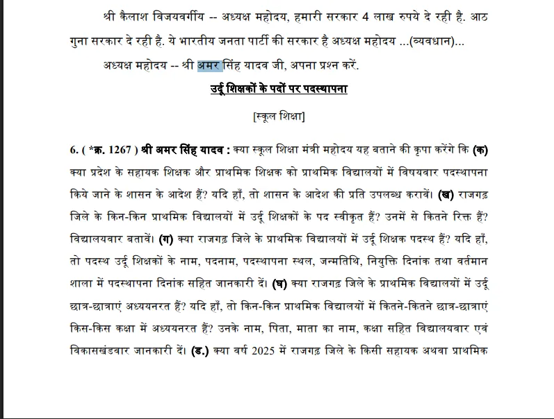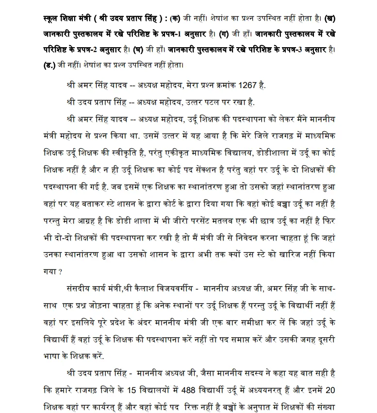 सरकार ने यह भी बताया कि, प्रदेश में जनजातीय विभाग के 1881 स्कूलों को बंद या मर्ज कर दिया गया है। कांग्रेस विधायक अमर सिंह यादव ने राजगढ़ जिले के उर्दू शिक्षकों पर सवाल उठाया। उन्होंने कहा, राजगढ़ के कई स्कूलों में स्टूडेंट्स नहीं हैं, लेकिन उर्दू शिक्षक हैं। संसदीय कार्यमंत्री कैलाश विजयवर्गीय ने कहा, राजगढ़ ही नहीं, पूरे प्रदेश में उर्दू शिक्षकों की समीक्षा करनी चाहिए।