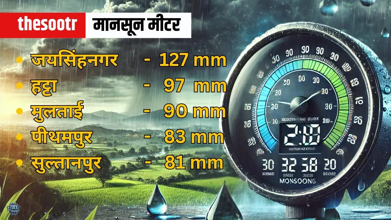 गुरुवार को MP के जयसिंहनगर में 127.0 मिमी, हट्टा में 97.6 मिमी, मुलताई में 90.7 मिमी, पीथमपुर में 83.0 मिमी, सुल्तानपुर में 81.4 मिमी और इटारसी में 81.2 मिमी बारिश दर्ज की गई।