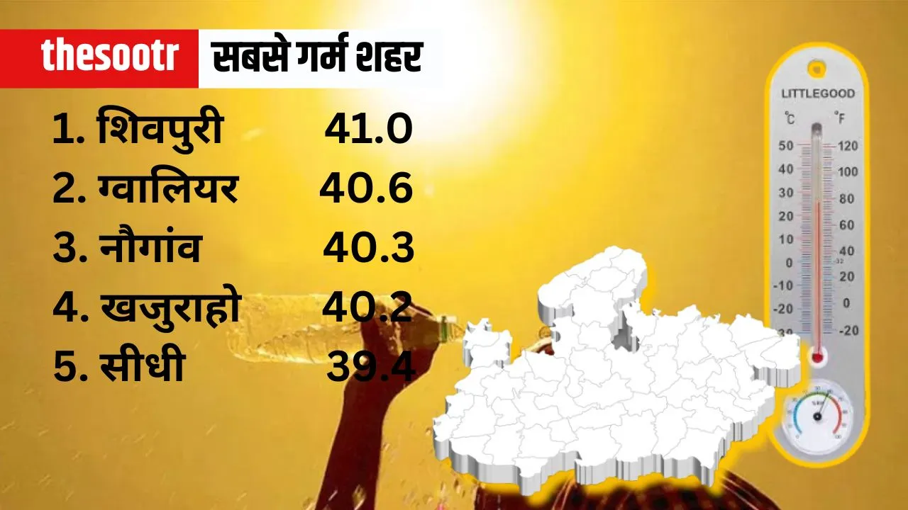 सोमवार को शिवपुरी सबसे अधिक गर्म रहा, जहां अधिकतम तापमान 41.0 डिग्री सेल्सियस रहा। ग्वालियर में 40.6 डिग्री, नौगांव में 40.3 डिग्री, खजुराहो में 40.2 डिग्री और सीधी में 39.4 डिग्री सेल्सियस तापमान रिकॉर्ड किया गया।