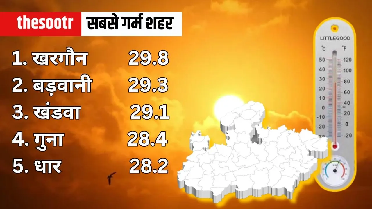 दूसरी तरफ, अमरकंटक में दिन का तापमान 22.4 डिग्री तक आ गया। खरगौन में 29.8 डिग्री, बड़वानी में 29.3 डिग्री, खंडवा में 29.1 डिग्री, गुना में 28.4 डिग्री और धार में 28.2 डिग्री सेल्सियस रिकॉर्ड किया गया।
