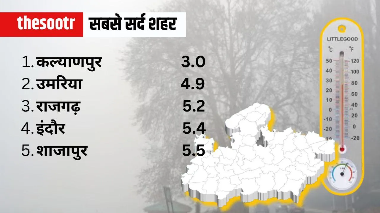 मध्यप्रदेश के पांच सबसे ठंडे शहरों में कल्याणपुर ने सबसे कम तापमान दर्ज किया, जहां का तापमान 3.0 था। इसके बाद उमरिया (4.9), राजगढ़ (5.2), इंदौर(5.4), और शाजापुर (5.5) जैसे शहरों में भी ठंड बढ़ गई है। इन शहरों में सर्दी का असर ज्यादा महसूस किया जा रहा है और आने वाले दिनों में ठंडी हवा के कारण तापमान में और गिरावट का अनुमान है।