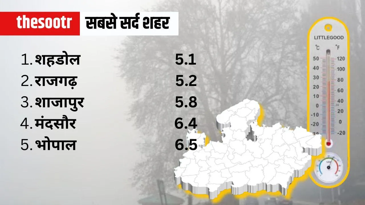 मध्यप्रदेश के पांच सबसे ठंडे शहरों में शहडोल ने सबसे कम तापमान दर्ज किया, जहां का तापमान 5.1 था। इसके बाद राजगढ़ (5.2), शाजापुर (5.8), मंदसौर(6.4), और भोपाल (6.5) जैसे शहरों में भी ठंड बढ़ गई है। इन शहरों में सर्दी का असर ज्यादा महसूस किया जा रहा है और आने वाले दिनों में ठंडी हवा के कारण तापमान में और गिरावट का अनुमान है।