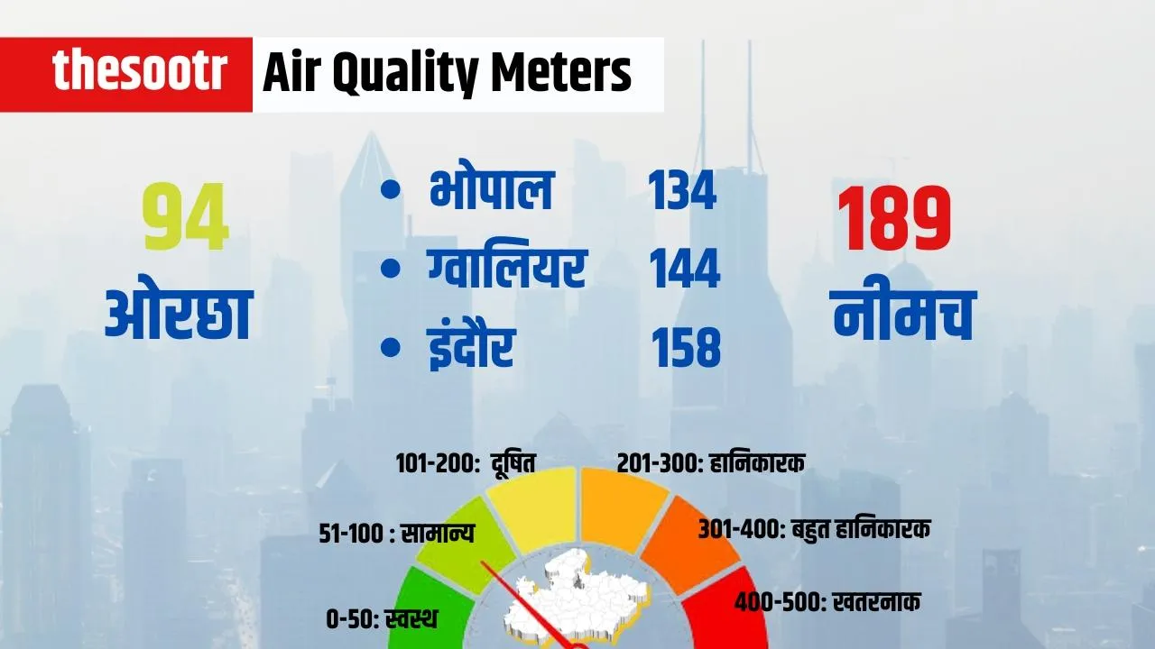 मध्यप्रदेश की हवा में इन दिनों बदलाव देखने को मिल रहा है। मध्य प्रदेश के शहर ओरछा की हवा प्रदेश के अच्छी हवा वाले शहरों में शामिल हो गई है। वहीं नीमच शहर की हवा में काफी गिरावट देखने को मिली और यहां का एक्यूआई 189 दर्ज किया गया।