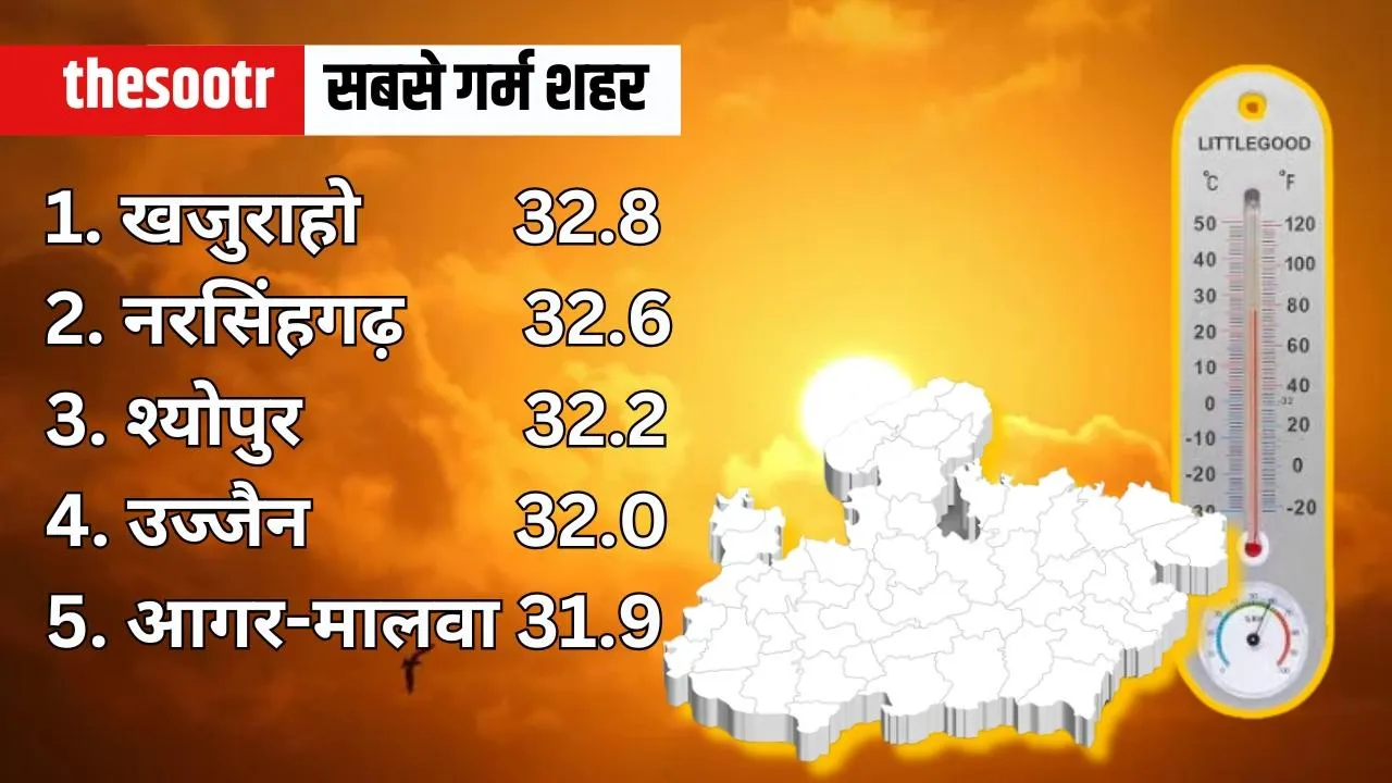 दूसरी तरफ, पचमढ़ी में दिन का तापमान 24.2 डिग्री तक आ गया। खजुराहो में 32.8 डिग्री, नरसिंहगढ़ में 32.6 डिग्री, श्योपुर में 32.2 डिग्री, उज्जैन में 32.0 डिग्री और आगर-मालवा में 31.9 डिग्री सेल्सियस रिकॉर्ड किया गया।