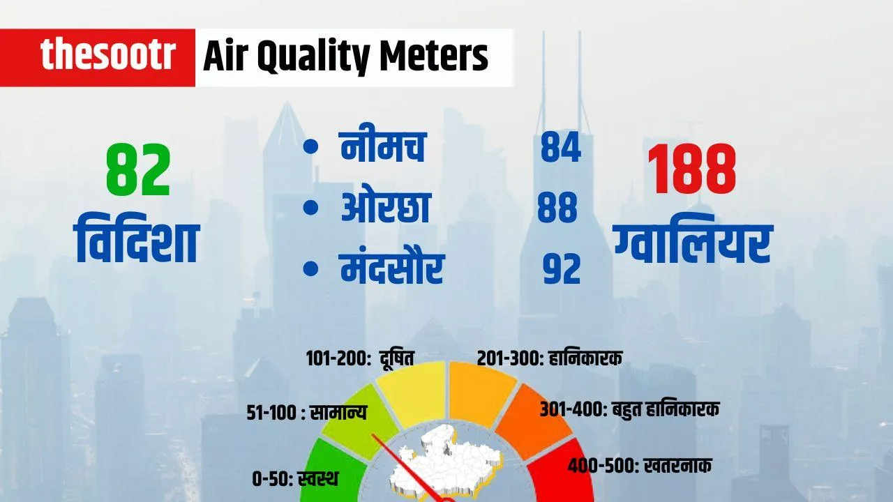 मध्यप्रदेश की हवा में इन दिनों बदलाव देखने को मिल रहा है। मध्य प्रदेश के शहर ओरछा की हवा प्रदेश के अच्छी हवा वाले शहरों में शामिल हो गई है। वहीं ग्वालियर शहर की हवा में काफी गिरावट देखने को मिली और यहां का एक्यूआई 188 दर्ज किया गया।