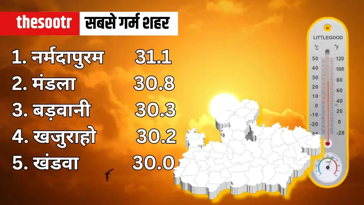 दूसरी तरफ, पचमढ़ी में दिन का तापमान 24.6 डिग्री तक आ गया। नर्मदापुरम में 31.1 डिग्री, मंडला में 30.8 डिग्री, बड़वानी में 30.3 डिग्री, खजुराहो में 30.2 डिग्री और खंडवा में 30.0 डिग्री सेल्सियस रिकॉर्ड किया गया।