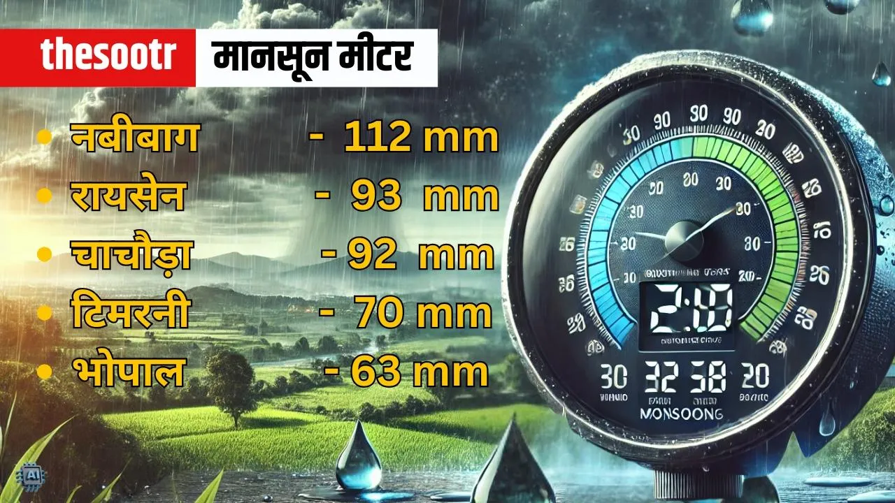 सोमवार को MP के नबीबाग में 112.0 मिमी, रायसेन में 93.2 मिमी, चाचौड़ा में 92.0 मिमी, टिमरनी में 70.2 मिमी, भोपाल में 63.4 मिमी और बिरसा में 59.0 मिमी बारिश दर्ज की गई।