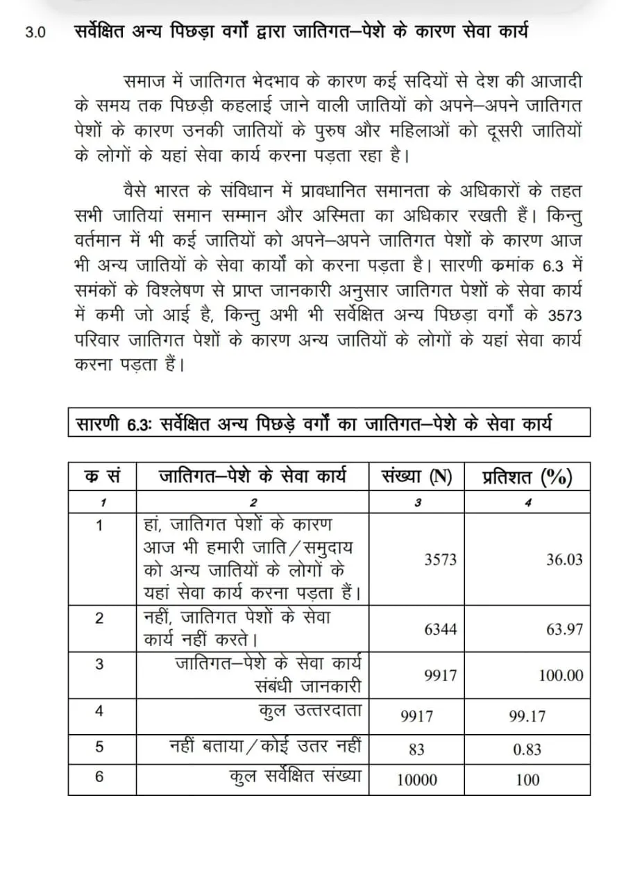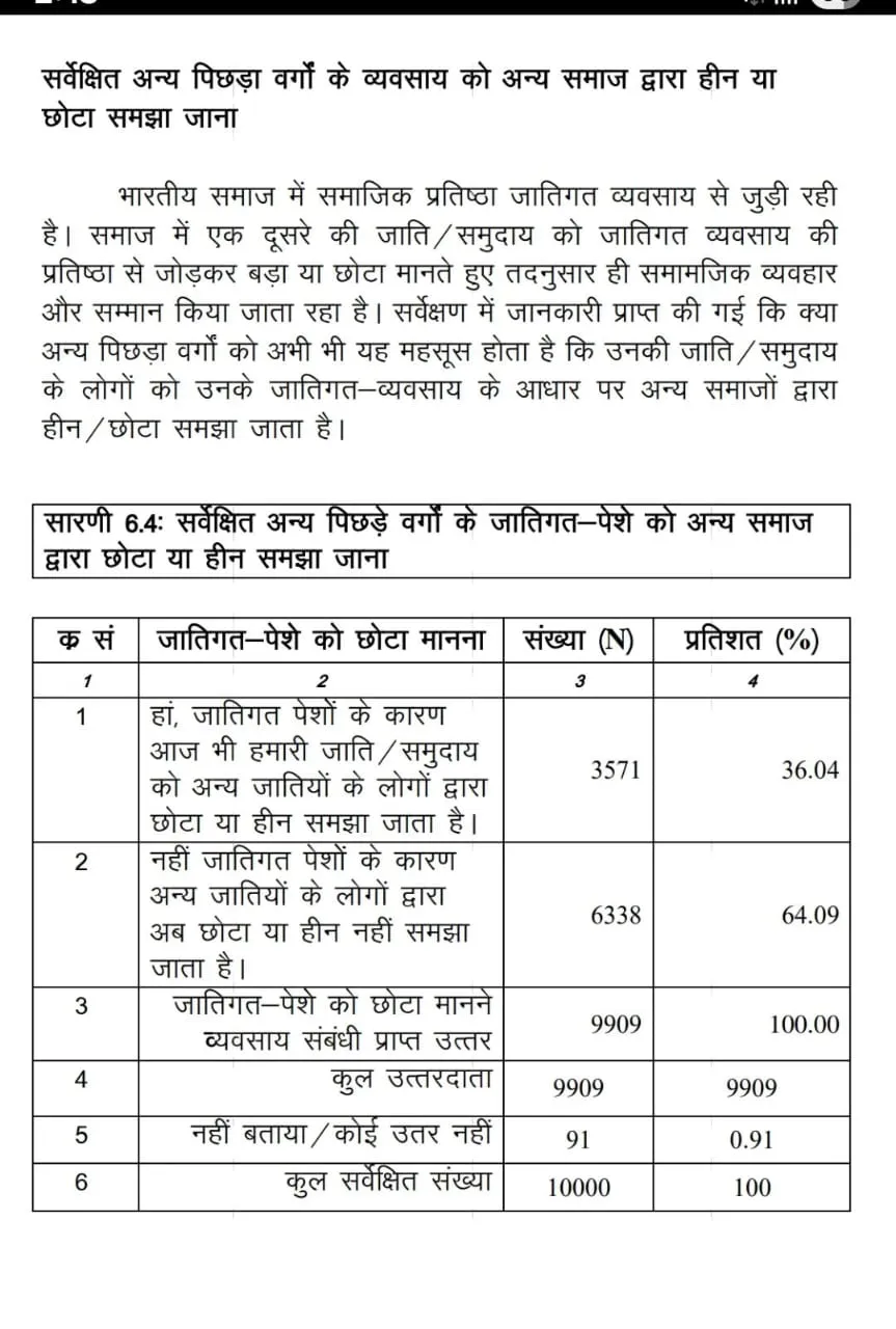 ओबीसी स्टडी रिपोर्ट में बताया गया है कि सर्वे में शामिल ओबीसी में से 36 फीसदी ने माना है कि उनके साथ जातिगत पेशे के कारण सामाजिक रूप से भेदभाव किया जाता है। साथ ही, उन्हें पिछड़ा माना जाता है।