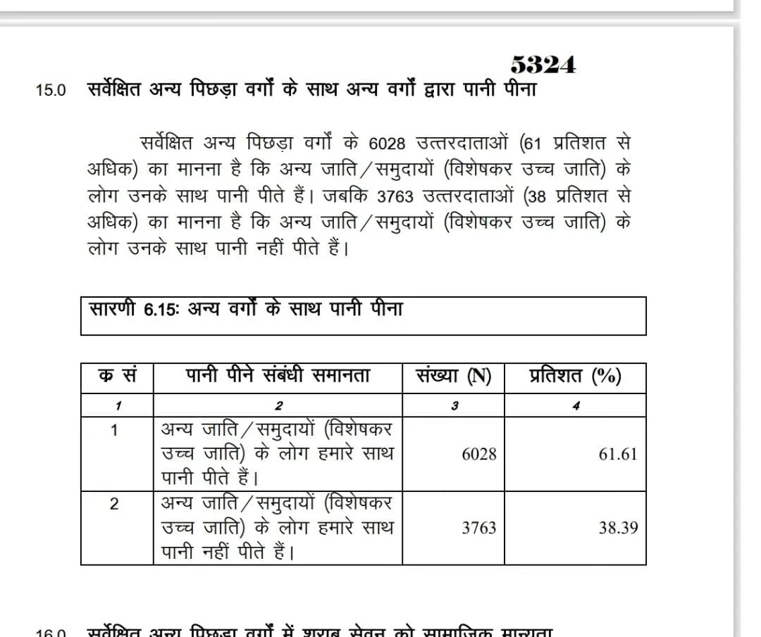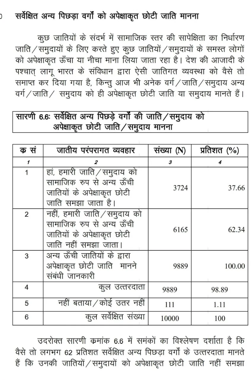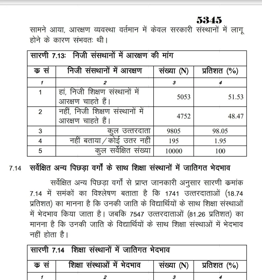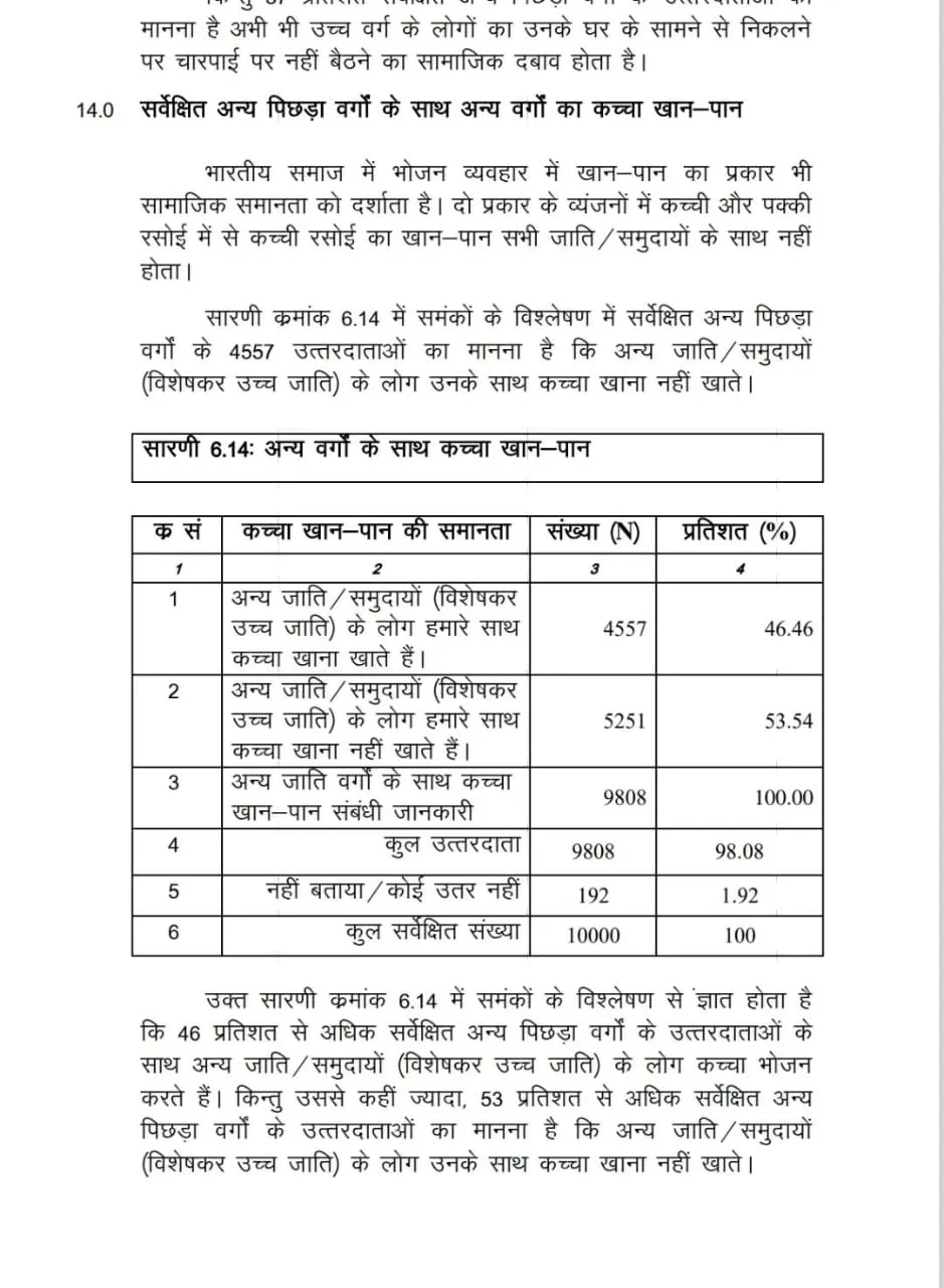 सर्वे में पाया गया कि 53 फीसदी ओबीसी लोगों ने माना कि उच्च जाति के लोग उनके साथ कच्चा खाना नहीं खाते हैं। वहीं, 38 फीसदी ने माना कि उच्च जाति के लोग उनके साथ पानी भी नहीं पीते हैं। साथ ही, 51 फीसदी लोग चाहते हैं कि निजी शिक्षण संस्थानों में भी आरक्षण दिया जाए।