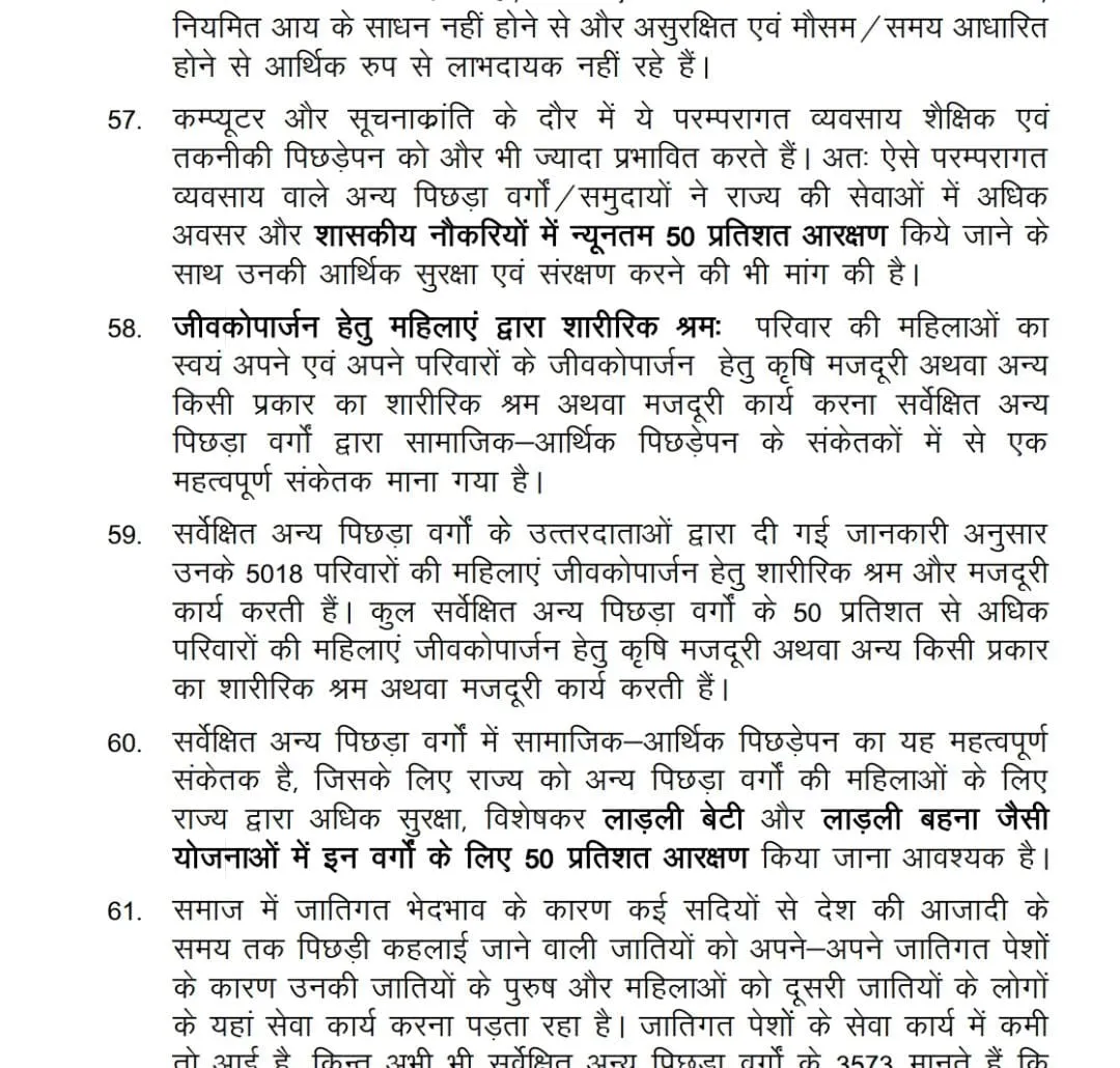 स्टडी रिपोर्ट में यह भी कहा गया है कि इस वर्ग में महिलाओं की स्थिति खराब है। इन्हें शारीरिक श्रम, मजदूरी जैसे कार्य करने होते हैं। इसके लिए जरूरी है कि लाड़ली बेटी, लाड़ली बहना जैसी योजनाओं में इस वर्ग को 50 फीसदी आरक्षण दिया जाए।