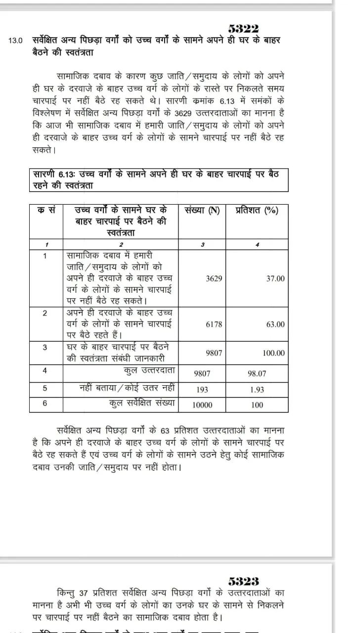सर्वे में शामिल 57 फीसदी ओबीसी ने माना कि जब उच्च जाति के लोग उनके घर के सामने से गुजरते हैं तो वे चारपाई, खाट, तख्त पर नहीं बैठ सकते और उन्हें खड़ा होना पड़ता है। स्टडी ने माना कि उनके सामाजिक उत्थान के लिए विशेष प्रयास की जरूरत है।