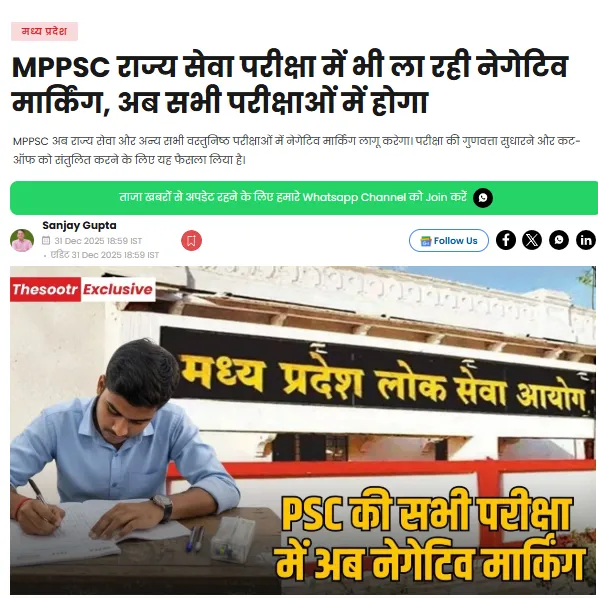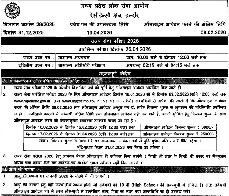 राज्य सेवा परीक्षा 2026 (mppsc 2026) का नोटिफिकेशन 31 दिसंबर बुधवार को रात को जारी हो गया है। इसमें प्री परीक्षा में नेगेटिव मार्किंग सिस्टम रहेगा। यह पहली बार ( (MP News) ) होने जा रहा है। अब गलत जवाब देने पर नंबर कटेंगे।