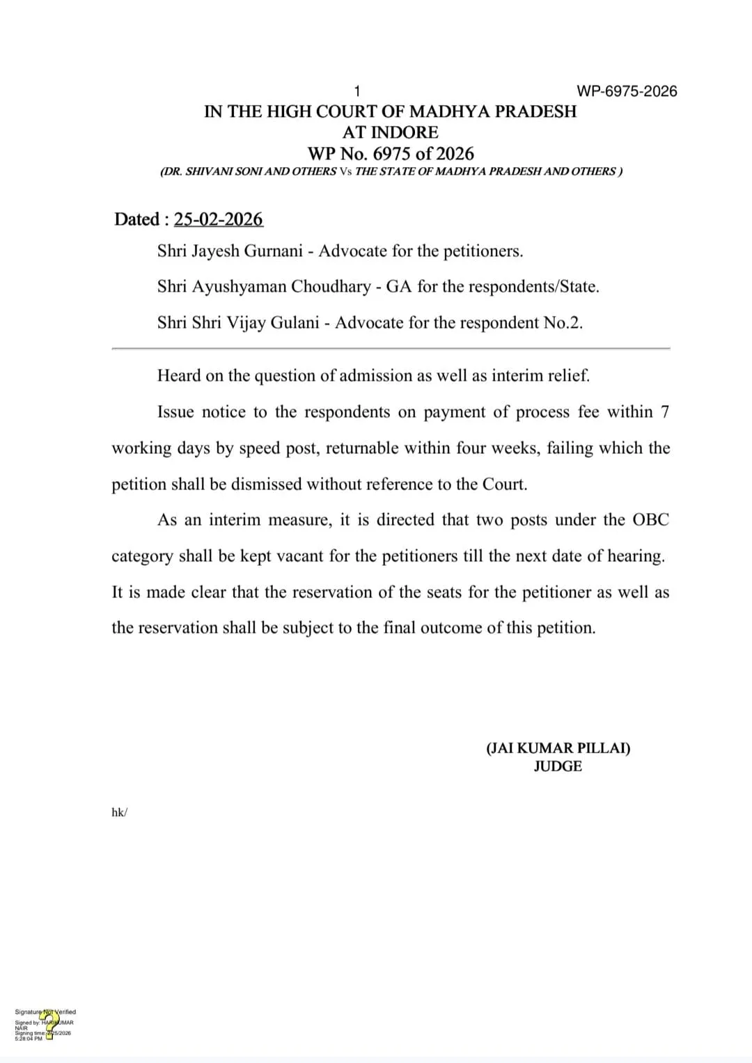अधिवक्ता गुरनानी ने तर्क रखे कि EWS वर्ग के लिए 10 प्रतिशत आरक्षण कुल विज्ञापित पदों में से नहीं दे सकते हैं। यह अनारक्षित वर्ग के लिए रखे गए पदों में से दिया जाना चाहिए था। इसके चलते अन्य वर्ग में भी सीट गलत आरक्षित की गई। इन तर्कों को सुनने के बाद हाईकोर्ट ने आयोग व शासन से जवाब मांगा है। साथ ही अंतरिम आदेश देते हुए दोनों याचिकाकर्ताओं के लिए ओबीसी कैटेगरी की दो सीट होल्ड करते हुए इन्हें रिक्त रखने के आदेश दिए हैं।