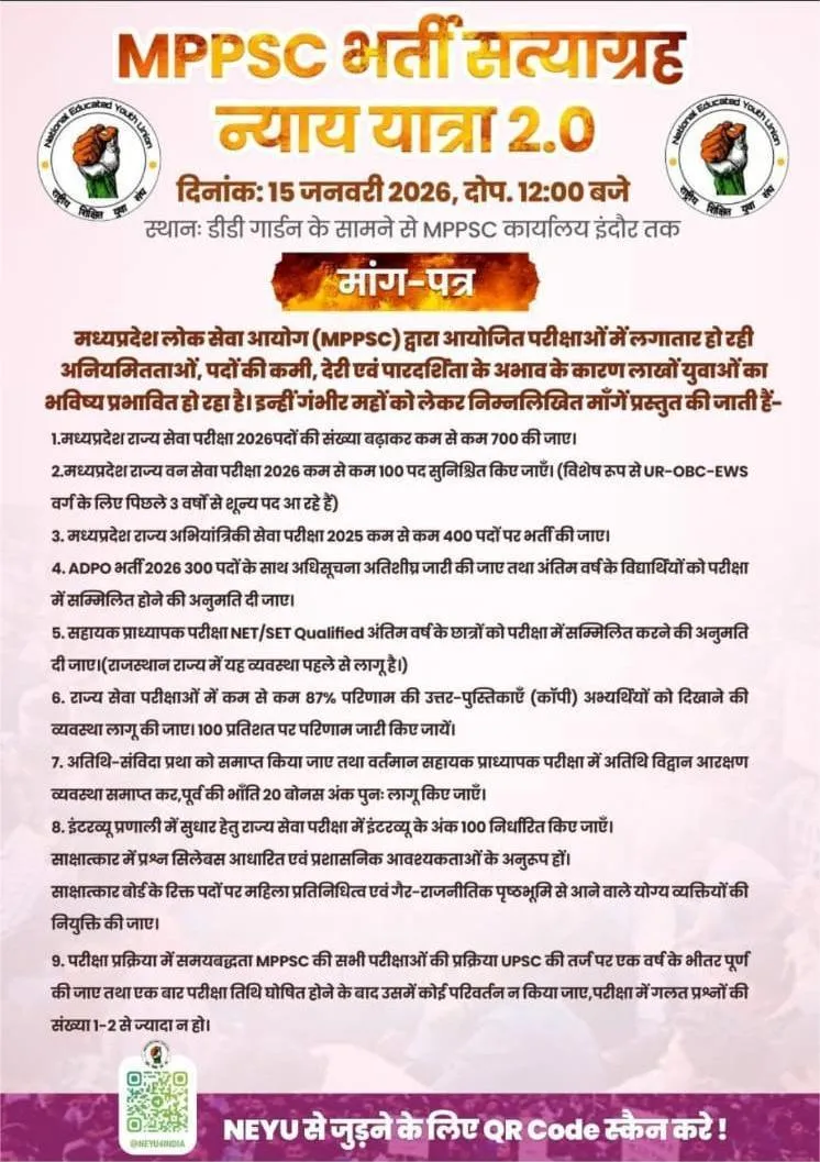 INDORE. मध्यप्रदेश लोक सेवा आयोग की परीक्षाओं को लेकर एनईवाययू ने न्याय यात्रा 2.0 का आह्वान किया गया है। इसके लिए कुल नौ मांगों का ज्ञापन तैयार किया गया है।
