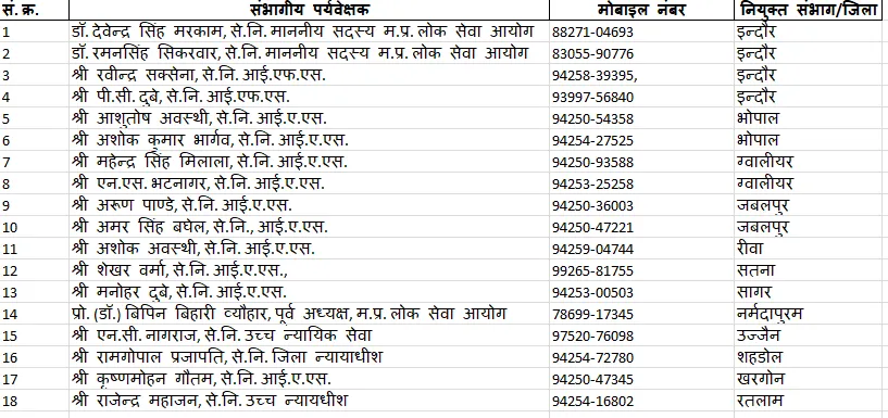MPPSC SET Exam : परीक्षा केंद्रों की निगरानी के लिए 18 संभागीय पर्यवेक्षकों (divisional supervisors) की नियुक्ति की गई है। अगर आपको परीक्षा में कहीं भी कोई गड़बड़ी या नकल की आशंका दिखे। तो आप तुरंत इन अधिकारियों से संपर्क कर सकते हैं। आयोग ने इन 18 संभागीय पर्यवेक्षकों (divisional supervisors) की लिस्ट जारी कर दी है।