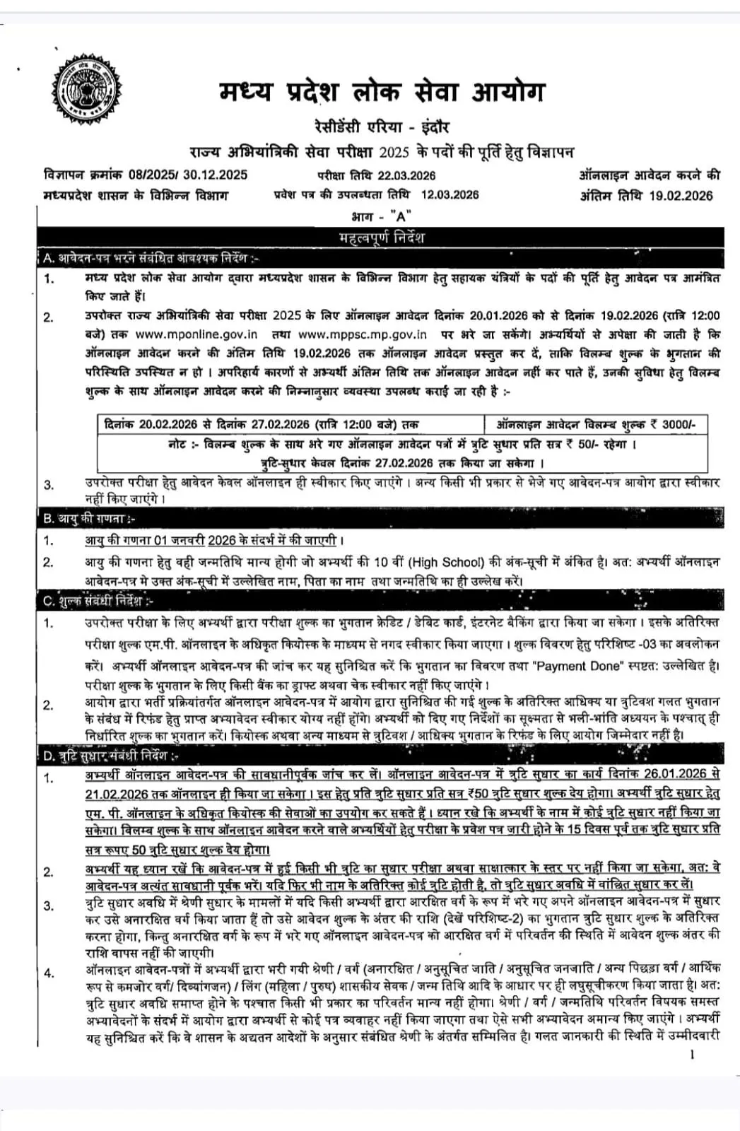 INDORE. मध्यप्रदेश लोक सेवा आयोग ने स्टेट इंजीनियरिंग परीक्षा 2025 के लिए 30 दिसंबर को विज्ञापन जारी किया था। इसके लिए अभी आवेदन भरे जा रहे हैं। वहीं, विज्ञापन में 32 पदों में से 23 पद दिव्यांग कैटेगरी के हैं।