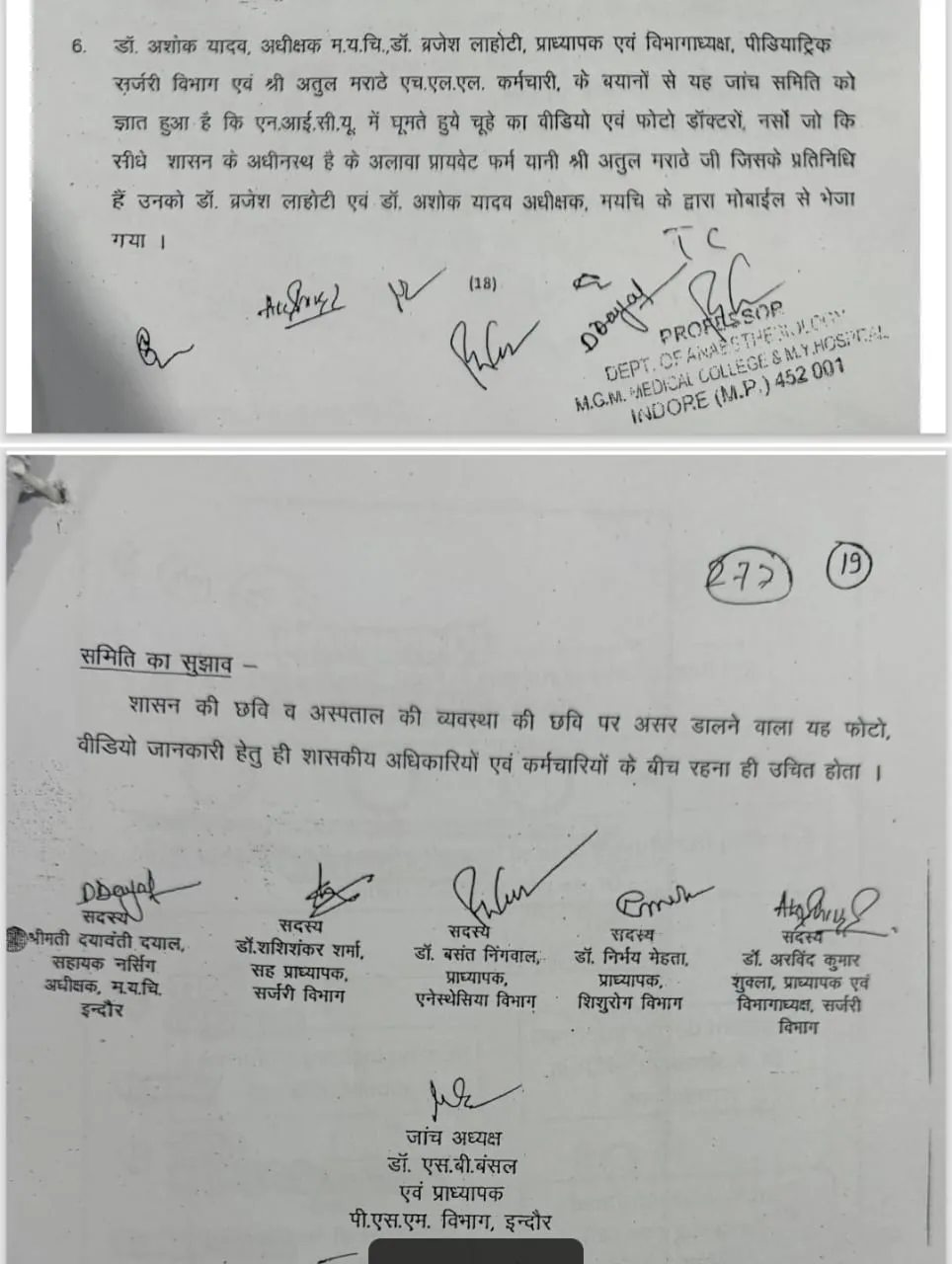 जांच कमेटी प्रमुख डॉ. एसबी बंसल थे। साथ में डॉ. अरविंद कुमार शुक्ला, डॉ. निर्भय मेहता, डॉ. बसंत निंगवाल, डॉ. शशिशंकर शर्मा, दयावंती दयाल आदि थे।