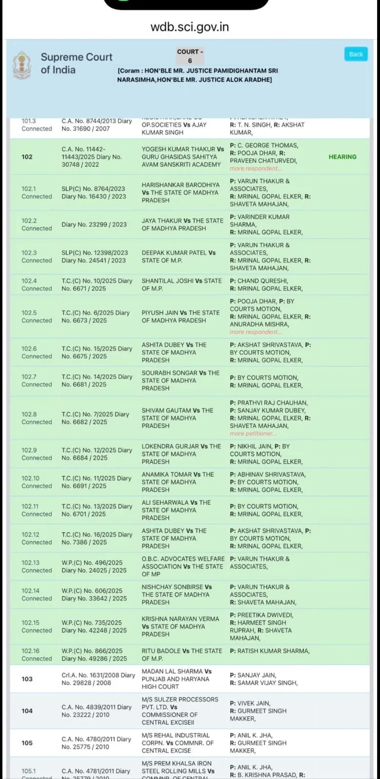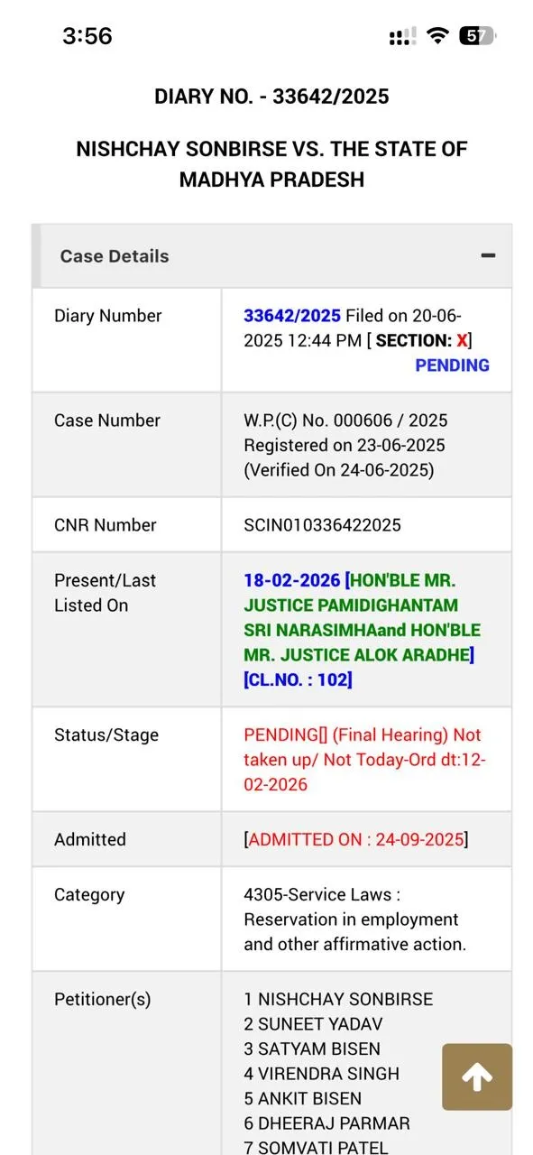 सुप्रीम कोर्ट जस्टिस पी नरसिम्हा और जस्टिस ओलको अराधे की बेंच में यह सुनवाई हुई। इसमें पहले बात हुई कि इसे टाप ऑफ लिस्ट 18 मार्च को सुनेंगे और इसमें छत्तसीगढ़ मुद्दे को पहले सुना जाएगा। वह हो गया तो मप्र का भी तय हो जाएगा। लेकिन इस पर ओबीसी वेलफेयर कमेटी अधिवक्ता वरूण ठाकुर ने पुरानी बात कही कि 6 साल से मामला अटका है। नियुक्ति पाए हुए लोग इंतजार कर रहे हैं। कम से कम अंतरिम राहत दी जाए, जैसे की छत्तीसगढ़ पर दी गई है।