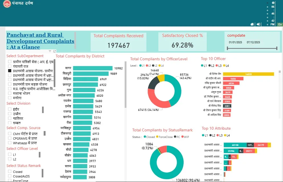 पंचायत दर्पण मध्यप्रदेश की पंचायती राज व्यवस्था से जुड़े काम ही नहीं बल्कि शिकायतों का भी ब्यौरा भी दर्शाता है। बीते माह तक पोर्टल पर पंचायती राज से संबंधित 14943 शिकायतें मुरैना जिले से आई हैं।