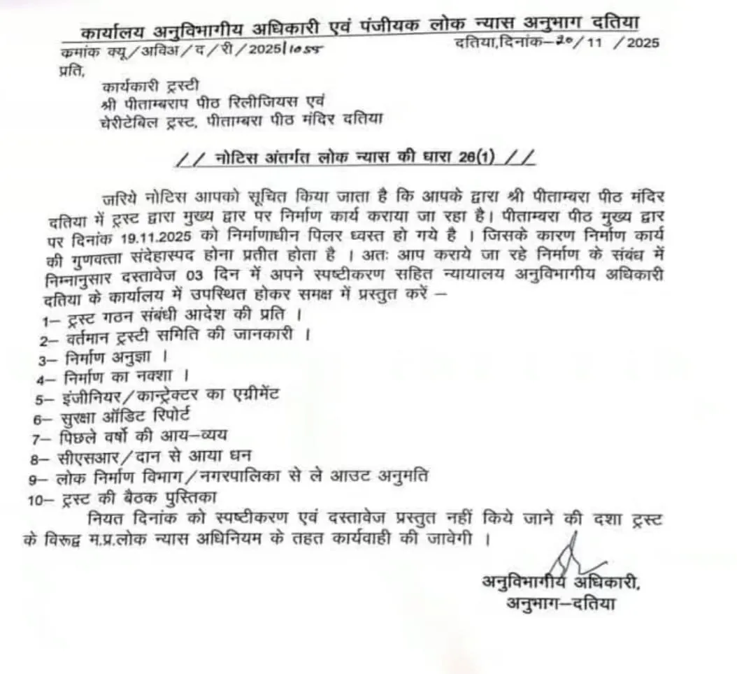 BHOPAL.दतिया के प्रसिद्ध श्री पीतांबरा पीठ मंदिर में निर्माणाधीन पिलर गिर गए। इस घटना के बाद लोक न्यास अनुभाग ने ट्रस्ट को नोटिस जारी किया है। 19 नवंबर को हुए निरीक्षण में मुख्य द्वार के निर्माण की गुणवत्ता पर गंभीर संदेह जताया गया।