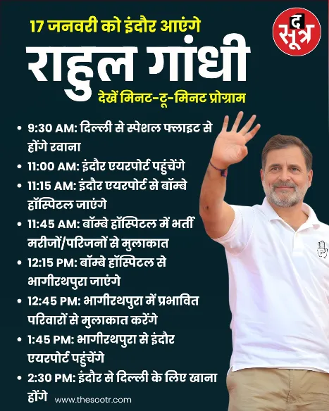 INDORE. लोकसभा में प्रतिपक्ष नेता राहुल गांधी का औपचारिक कार्यक्रम आ गया है। वह 17 जनवरी को इंदौर में भागीरथपुरा में गंदे पानी से हुई 24 मौतों को लेकर पीड़ितों से मिलने के लिए आ रहे हैं। द सूत्र के पास उनका औपचारिक कार्यक्रम है, जिसके तहत वह सुबह 11.15 बजे इंदौर पहुंचेंगे और दोपहर ढाई बजे दिल्ली के लिए रवाना हो जाएंगे।