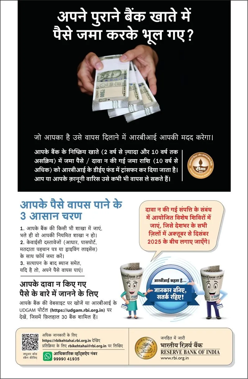 भारतीय रिजर्व बैंक इसके लिए विशेष कैंप भी शुरू कर रहा है। वहीं बैंक के ग्राहक रिजर्व बैंक के पोर्टल या संबंधित बैंक की वेबसाइट के जरिए भी निष्क्रिय खातों में जमा राशि के लिए क्लेम कर सकते हैं। इसके लिए आरबीआई पोर्टल www.udgam.rbi.org.in जाकर अपना दावा पेश किया जा सकता है।