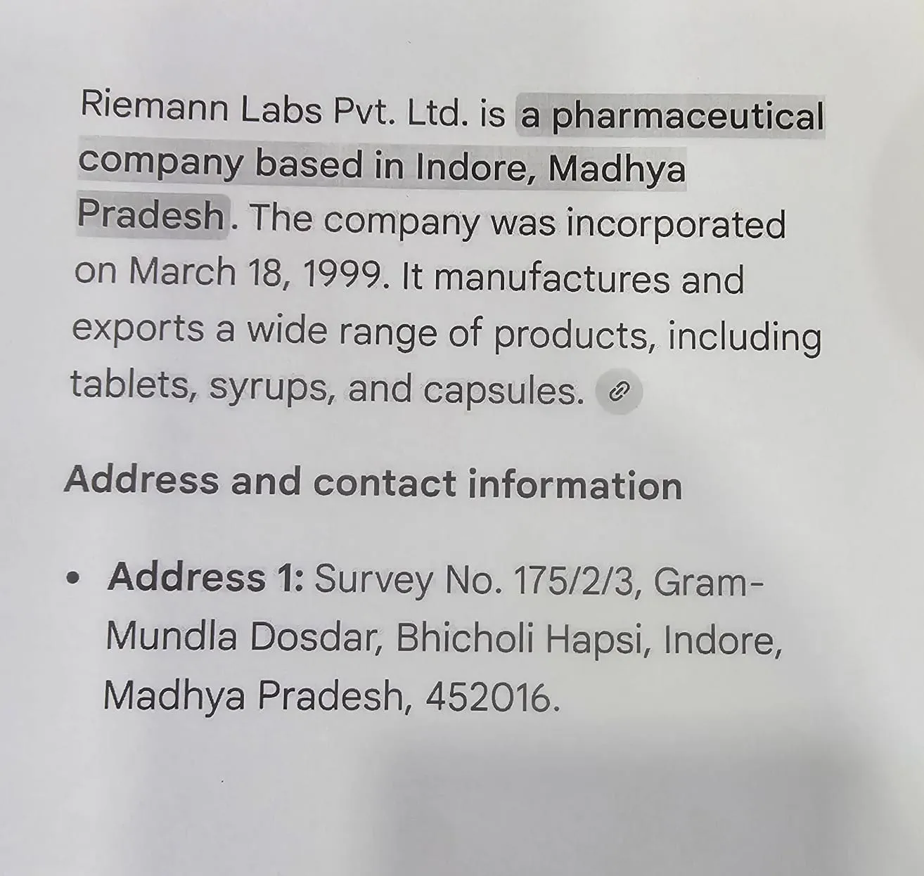 साल 2023 में तत्कालीन स्वास्थ्य राज्यमंत्री भारती प्रवीण पवार ने राज्यसभा में कहा था कि मेसर्स रीमैन लैब्स इंदौर का संयुक्त निरीक्षण किया गया और निष्कर्षों के आधार पर राज्य औषधि नियंत्रक मध्य प्रदेश ने कंपनी को निर्माण गतिविधियां बंद करने का निर्देश दिया है।