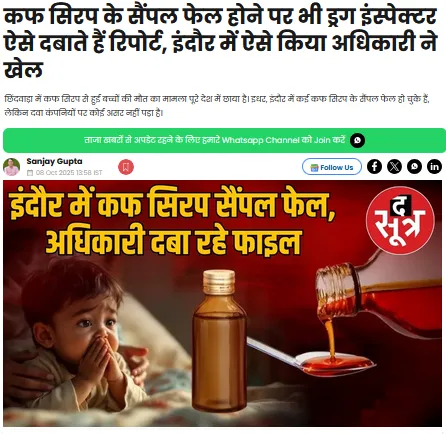 INDORE. कैमरून में 12 बच्चों की मौत का जिम्मेदार रीमैन लैब्स है और इस सब के पीछे इंदौर के ड्रग इंस्पेक्टर राजेश जीनवाल का हाथ है। उनकी मदद से फैक्ट्री के मालिकों ने अपनी दूसरी फैक्ट्री शुरू की और फिर से उत्पादन शुरू कर दिया। छिंदवाड़ा मामले के बाद, जब 8 अक्टूबर को द सूत्र ने यह खबर दी कि अधिकारियों ने इस मामले को दबा दिया था, तो अधिकारियों को होश आया और उन्होंने देर शाम कोर्ट में लैब्स के संचालकों के खिलाफ केस दायर किया। हालांकि, यह कार्रवाई दो साल पहले हो जानी चाहिए थी। इस पूरे मामले में ड्रग कंट्रोलर ने जुलाई 2025 में जीनवाल को आदेश दिया था कि कंपनी के खिलाफ केस दायर किया जाए, लेकिन वह टालमटोल करते रहे। फिर जब मामला तूल पकड़ा, तो जीनवाल ने चुपचाप छुट्टी लेकर चले गए।