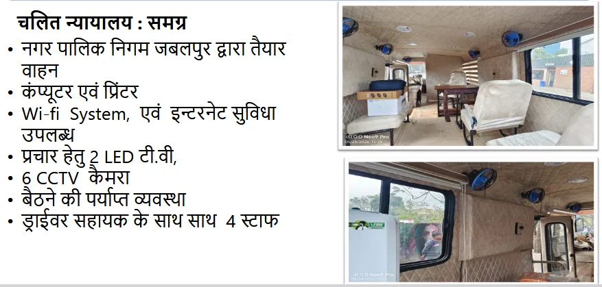 जबलपुर नगर निगम ने विशेष रूप इसे तैयार किया है। यह चलित न्यायालय वाहन आधुनिक तकनीकी सुविधाओं से लैस है। इसका उद्देश्य उन लोगों तक न्याय पहुंचाना है जो आर्थिक, सामाजिक या भौगोलिक कारणों से न्यायालय तक नहीं पहुंच पाते हैं। यह पहल न्याय को जमीनी स्तर तक ले जाने का प्रयास है।