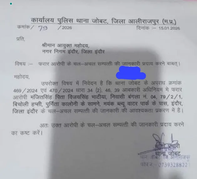 जोबट थाने ने हाल ही में इंदौर निगमायुक्त ( indore nagar nigam) को एक पत्र लिखा है। इसमें रिंकू भाटिया को फरार आरोपी बताते हुए उनकी संपत्तियों की जानकारी मांगी गई है। पत्र में लिखा गया है कि थाने में दर्ज केस के तहत फरार आरोपी मंजीत की चल और अचल संपत्तियों की जानकारी चाहिए।
