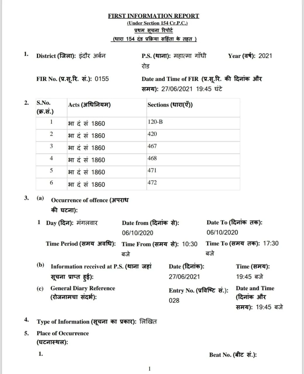 एमजी रोड थाने में 27 जून 2021 को यह फर्जी कोर्ट आदेश बनाने का केस हुआ था। इसमें अज्ञात आरोपी पर आईपीसी धारा 120बी, 420, 467, 468, 471 व 472 में केस हुआ था। अपराध होने का समय 6 अक्टूबर 2020 बताया गया था। थाने में जज विजयेंद्र सिंह रावत द्वारा केस दर्ज कराने के लिए आवेदन दिया था।