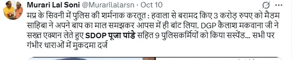 सिवनी जिले में तैनात SDOP पूजा पांडे पर हवाला कारोबारियों से ₹2.96 करोड़ लूटने का गंभीर आरोप है। 8-9 अक्टूबर की रात सिलादेही के जंगल में चेकिंग के दौरान, पूजा पांडे ने पुलिसकर्मियों के साथ मिलकर कटनी से जालना जा रही हवाला की रकम अपने कब्जे में ले ली थी।