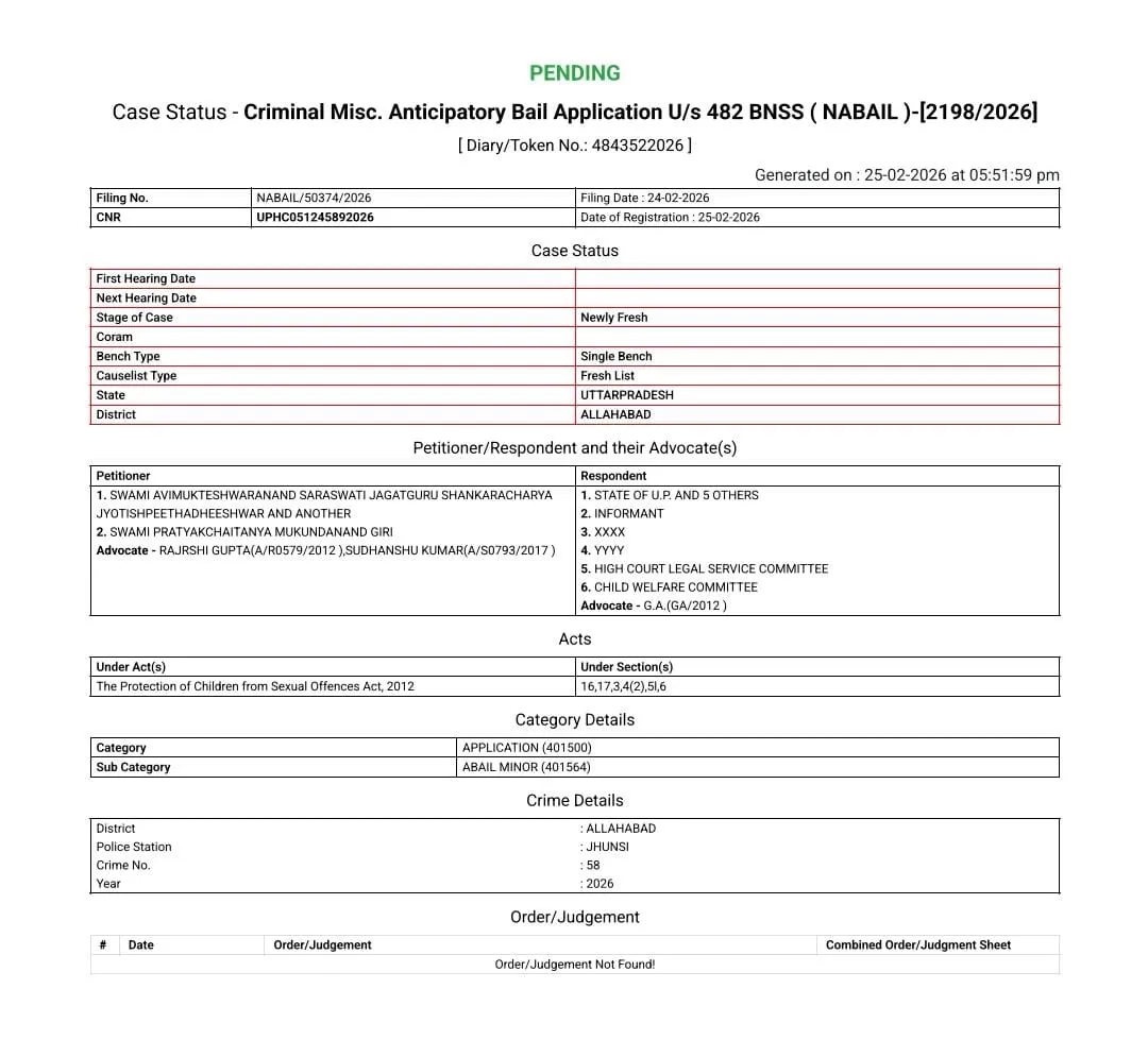 प्रयागराज में दर्ज पॉक्सो प्रकरण ने देशभर में व्यापक चर्चा को जन्म दिया है। स्वामी अविमुक्तेश्वरानंद सरस्वती और उनके शिष्य के खिलाफ गंभीर धाराओं में मामला दर्ज किया गया है। अब यह मामला न्यायिक प्रक्रिया के अहम चरण में पहुंच चुका है। मामला फिलहाल इलाहाबाद हाईकोर्ट में विचाराधीन हो गया है। जहां अग्रिम जमानत याचिका दाखिल की गई है।