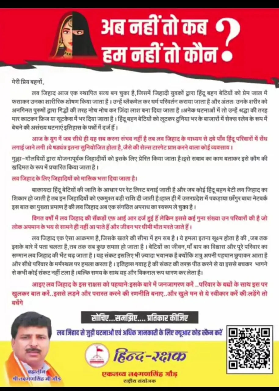 इंदौर जाग चुका है - अब समय है कि संपूर्ण भारत भी जागे... हमारी बेटियां और बहनें सुरक्षित, सशक्त और जागरूक रहें - यह हम सभी की साझा ज़िम्मेदारी है। हाल के वर्षों में यह देखने को मिला है कि लव जिहादियों द्वारा लगातार सनातनी लड़कियों को झूठी पहचान और धोखे से प्रेम संबंधों में फंसाया जा रहा है।