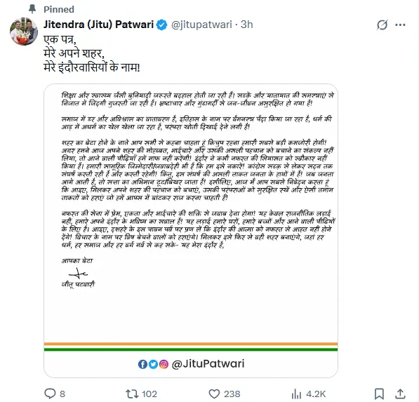 आइए, मिलकर अपने शहर की पहचान को बचाएं, उसकी परंपराओं को सुरक्षित रखें और ऐसी ताकतों को हराएं जो हमें आपस में बांटकर राज करना चाहती हैं। फिर से वही शहर बनाएंगे, जहां हर धर्म, हर समाज और हर वर्ग गर्व से कह सके यह मेरा इंदौर है। आपका बेटा, जीतू पटवारी