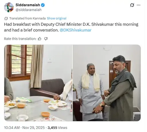 कर्नाटक में मुख्यमंत्री पद को लेकर चल रही खींचतान के बीच शनिवार सुबह सिद्धारमैया और डिप्टी सीएम डीके शिवकुमार ने एक साथ ब्रेकफास्ट किया। इसके बाद दोनों नेताओं ने एक जॉइंट प्रेस कॉन्फ्रेंस की। सिद्धारमैया ने कहा, "हमारे बीच कोई मतभेद नहीं है, और भविष्य में भी नहीं होंगे।" उन्होंने यह भी कहा कि वे मिलकर काम करेंगे। डीके शिवकुमार ने कहा, "हाईकमान जो भी निर्देश देगा, हम उसका पालन करेंगे।" उन्होंने ग्रुप बनाने की बात को नकारा किया। दोनों नेताओं की यह मुलाकात हाईकमान के आदेश पर हुई थी। पिछले 15 दिनों से दोनों गुटों के कार्यकर्ता अपने-अपने नेता को मुख्यमंत्री बनाना चाहते थे। हालांकि, पार्टी ने 2.5-2.5 साल के सीएम पद के समझौते को कभी पुष्टि नहीं की थी।