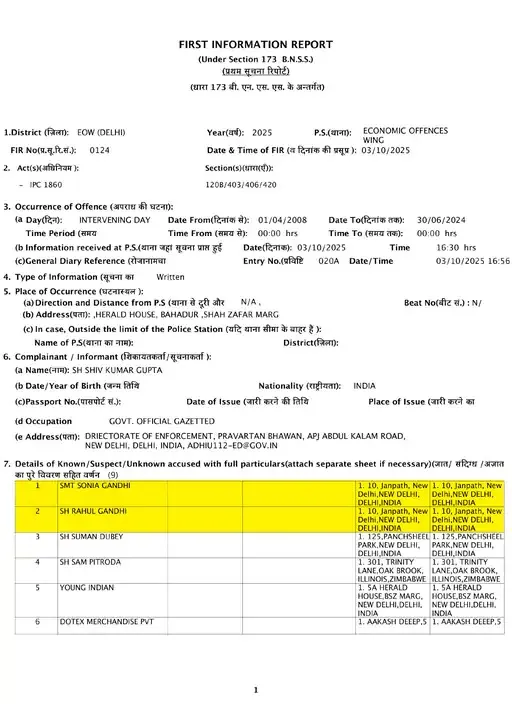 दिल्ली पुलिस की आर्थिक अपराध शाखा ने नेशनल हेराल्ड मामले में सोनिया और राहुल गांधी के खिलाफ नई FIR दर्ज की है। इस FIR में छह अन्य लोग और तीन कंपनियां शामिल हैं, जिनमें AJL, डोटेक्स मर्चेंडाइज और यंग इंडियन शामिल हैं। आरोप है कि इन कंपनियों ने धोखाधड़ी से AJL पर नियंत्रण हासिल किया। यंग इंडियन ने 1 करोड़ रुपये देकर AJL का नियंत्रण लिया, जिसमें राहुल और सोनिया गांधी की 76% हिस्सेदारी है। ED की शिकायत पर यह FIR 3 अक्टूबर को दर्ज की गई थी। कांग्रेस ने इसे राजनीतिक बदला बताया है।