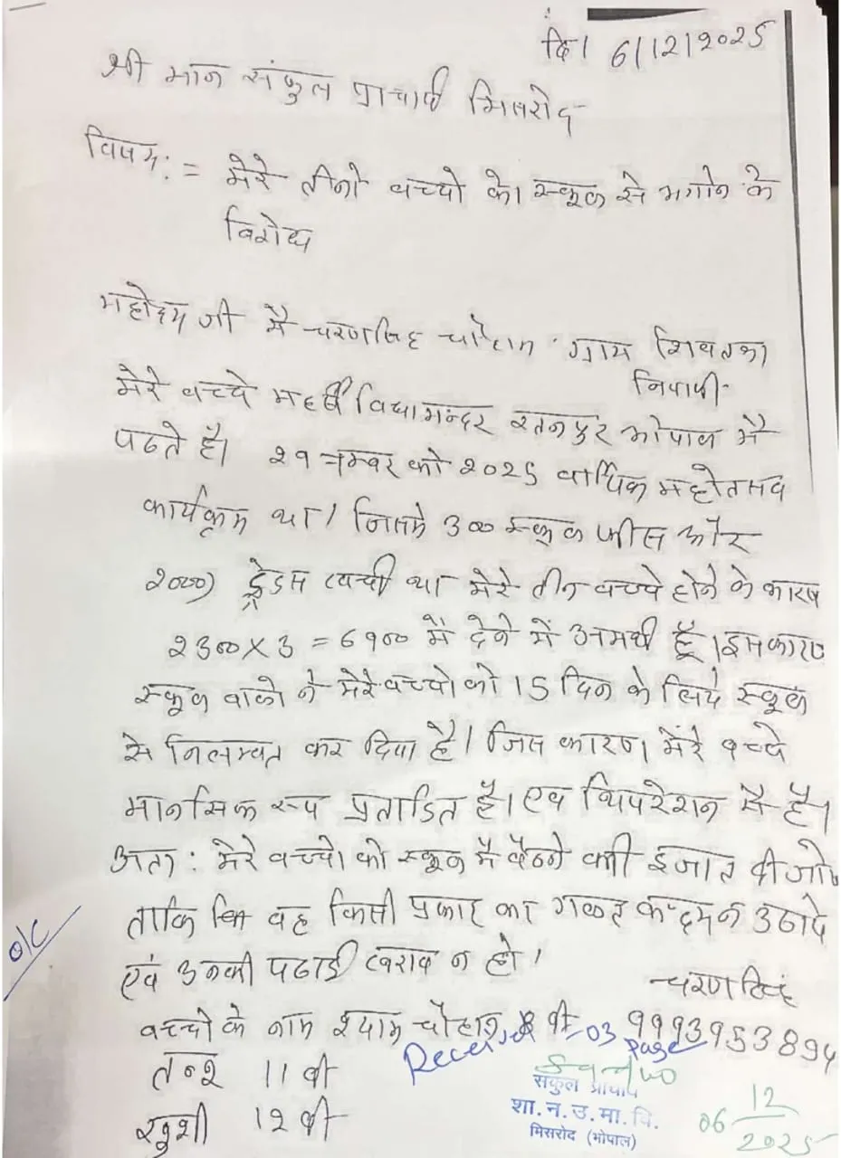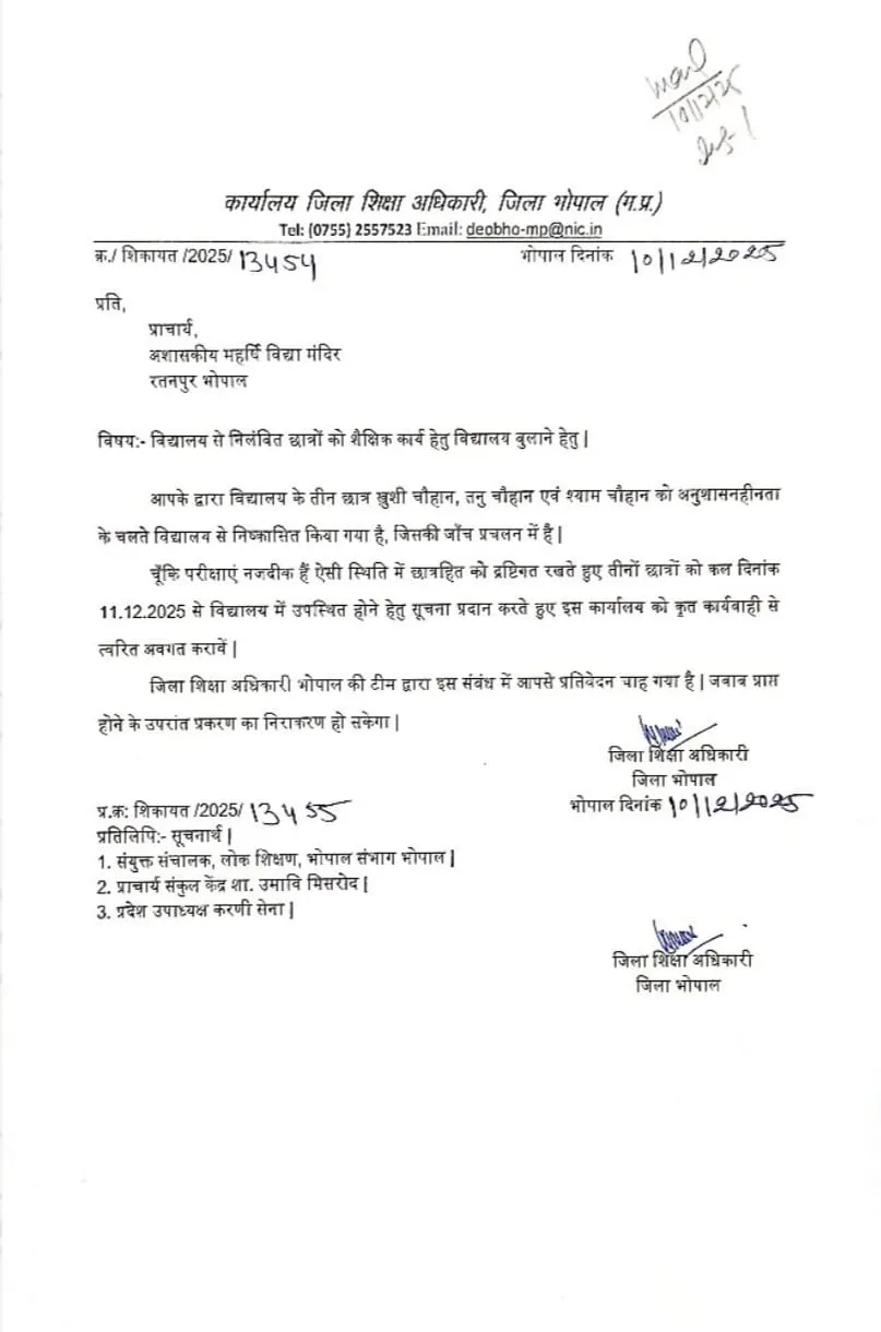 बुधवार देर शाम भोपाल डीईओ नरेंद्र अहिरवार ने पत्र जारी किया। उन्होंने विद्यालय प्राचार्य को तीनों बच्चों की गुरुवार से उपस्थिति सुनिश्चित करने का निर्देश दिया। साथ ही, पूरे प्रकरण पर विस्तृत रिपोर्ट तलब की गई है। द सूत्र ने विद्यालय प्राचार्य से उनका पक्ष जानने की कोशिश की, लेकिन स्टाफ ने बातचीत नहीं कराई।